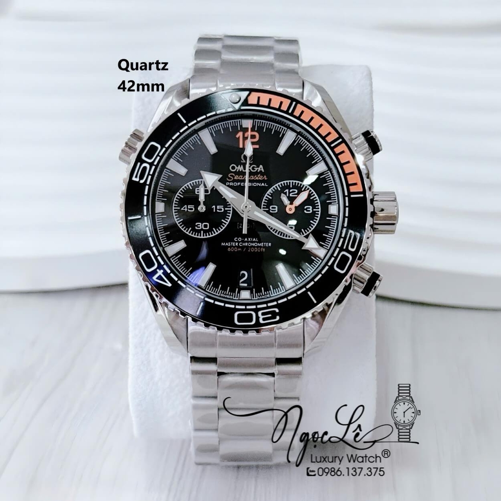 Đồng Hồ Nam Omega Quartz Dây Kim Loại 5 Kim - Màu Bạc Mặt Đen Viền Cam Size 42mm
