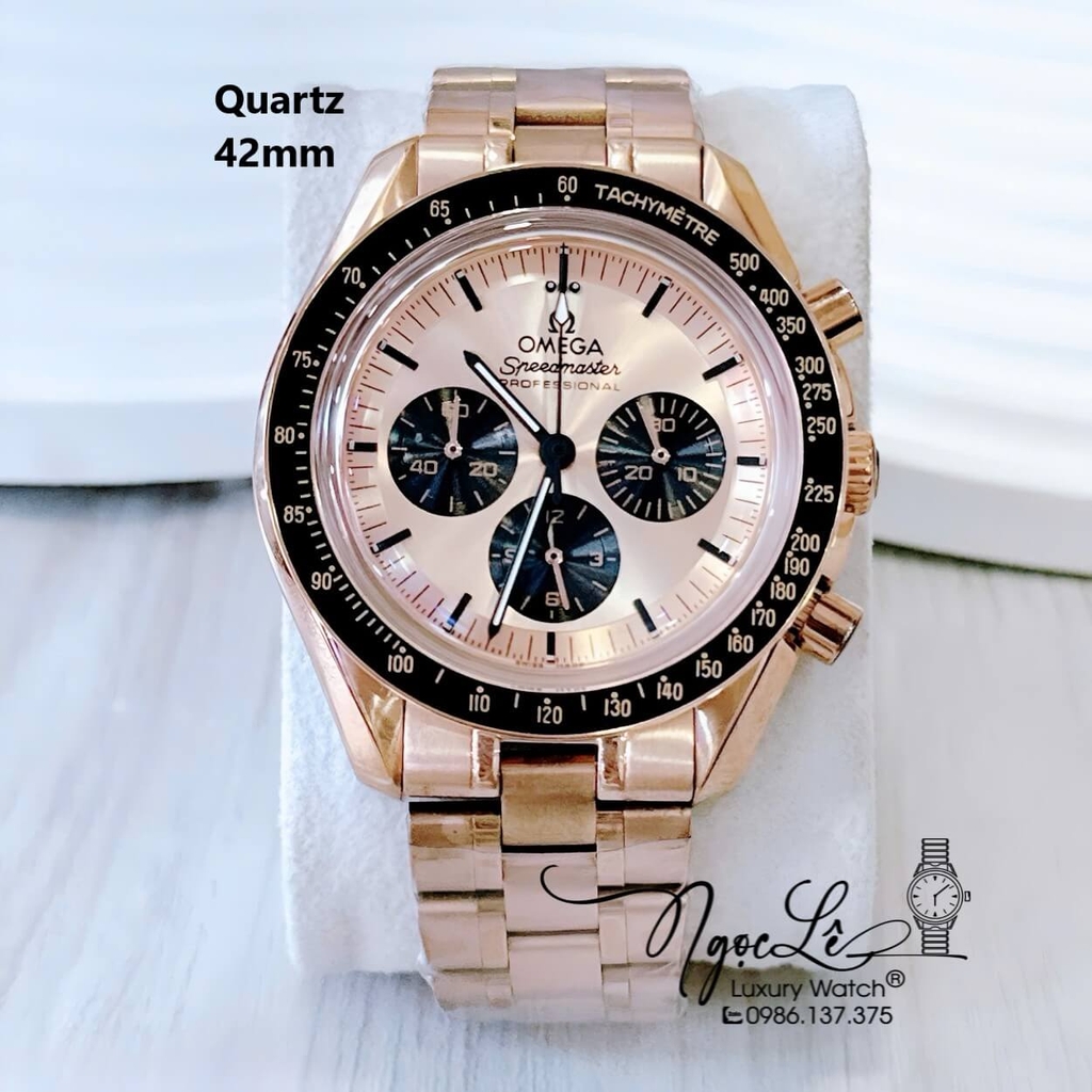 Đồng Hồ Nam Omega Quartz Dây Kim Loại 6 Kim - Màu Vàng Hồng Viền Đen Size 42mm
