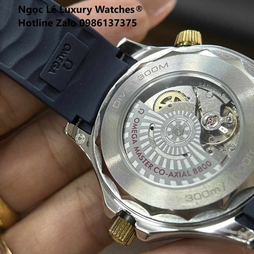 Hình Ảnh thực tế Đồng Hồ Nam Omega Seamaster Diver Automatic Dây Cao Su Xanh Size 41mm - Vỏ Demi Vàng Mặt Xanh