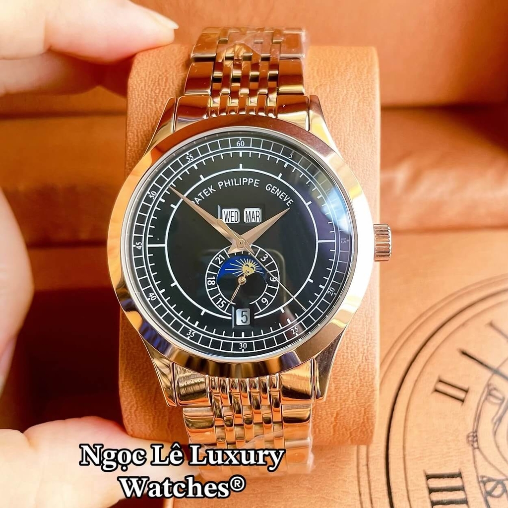 Đồng Hồ Nam Patek Philippe Complications Automatic mang phong cách sang trọng, đẳng cấp với dây kim loại thép không gỉ 316L mạ vàng hồng thời thượng, kết hợp mặt số đen mạnh mẽ. Máy cơ tự động chuẩn xác cùng chức năng lịch trăng sao 24h cao cấp, mang lại sự tinh tế cho quý ông hiện đại.
