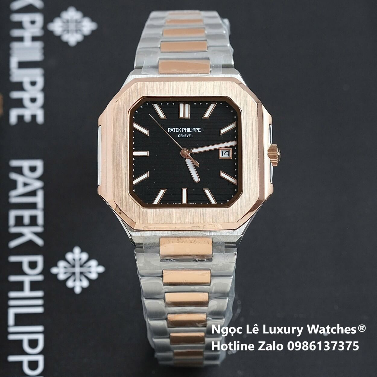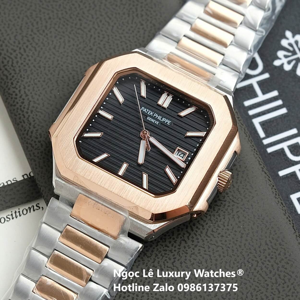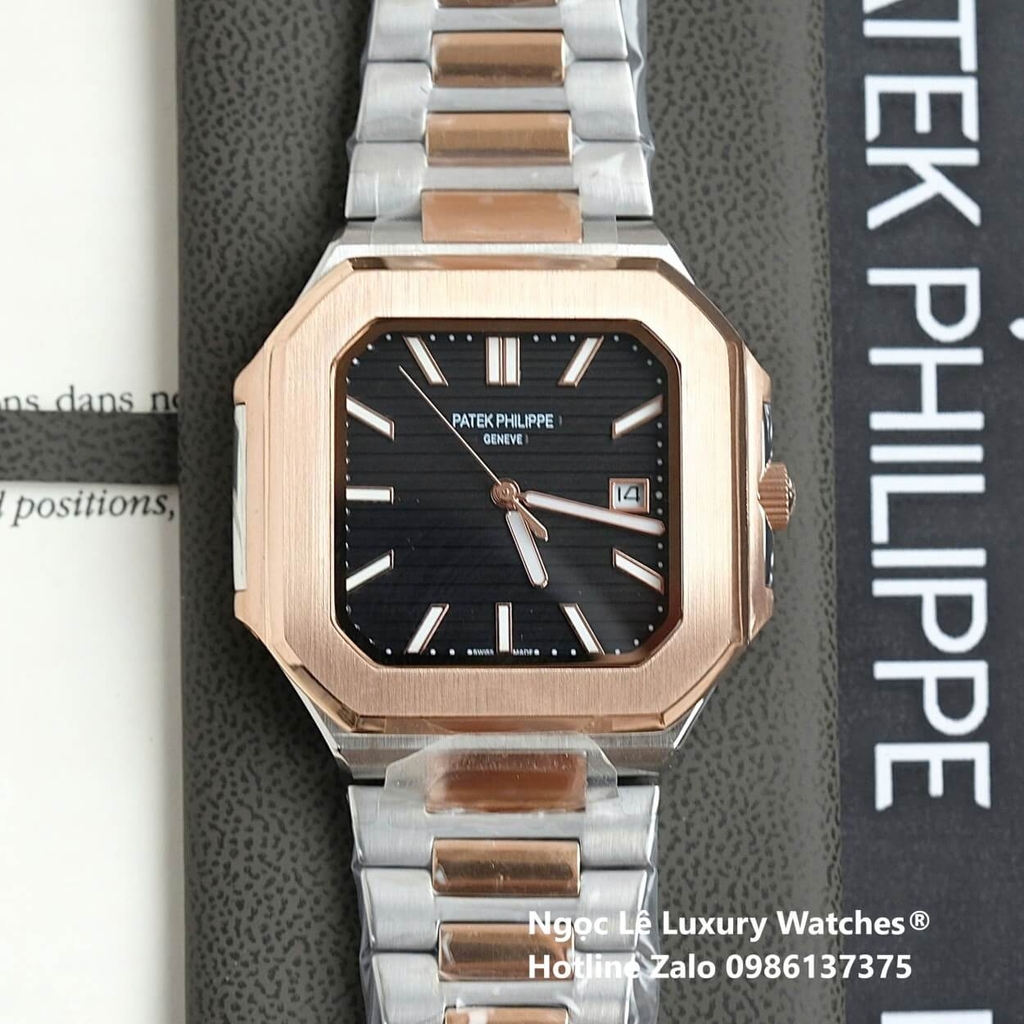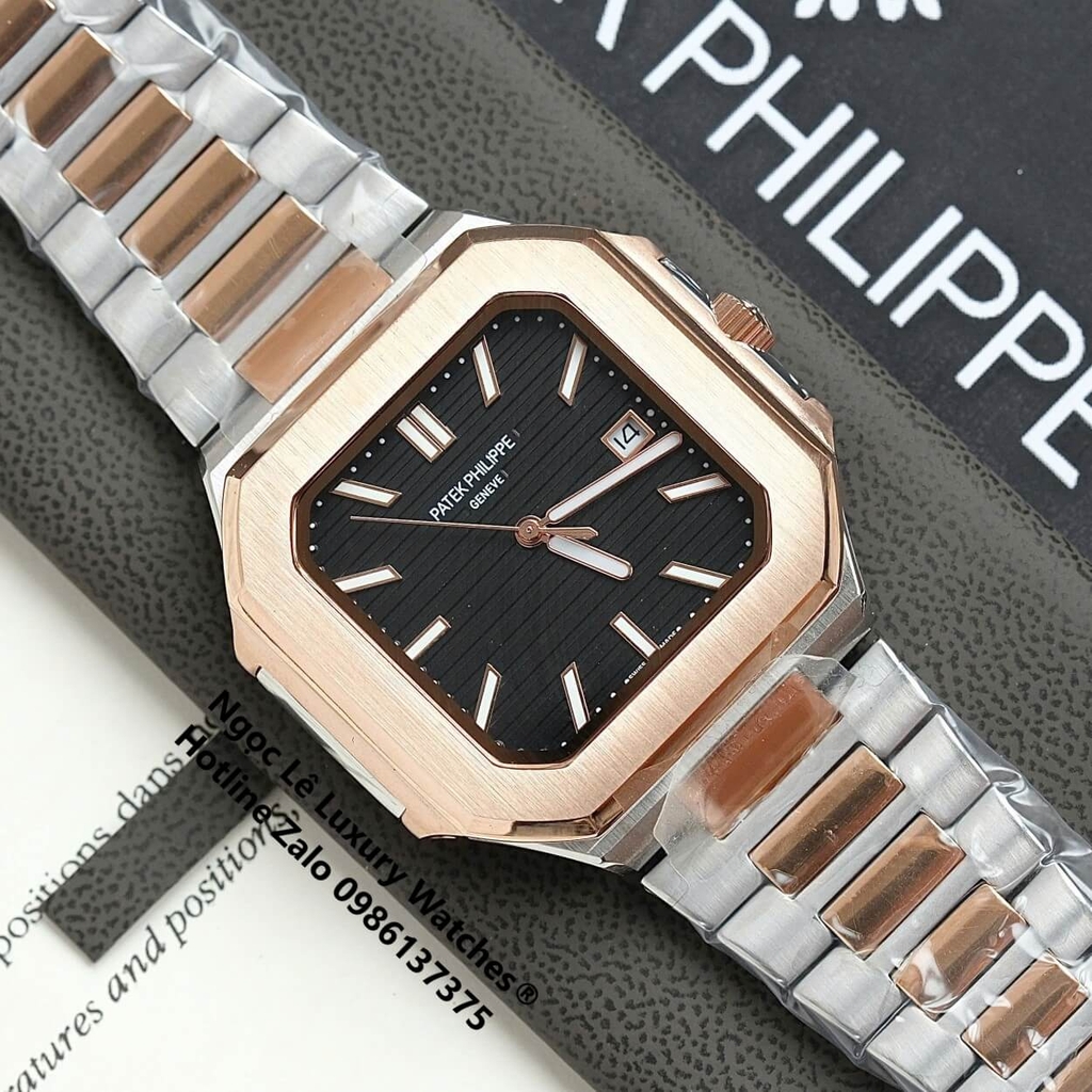 Đồng Hồ Nam Patek Philippe Cubitus Automatic Dây Demi Vàng Hồng Mặt Đen Size 40mm