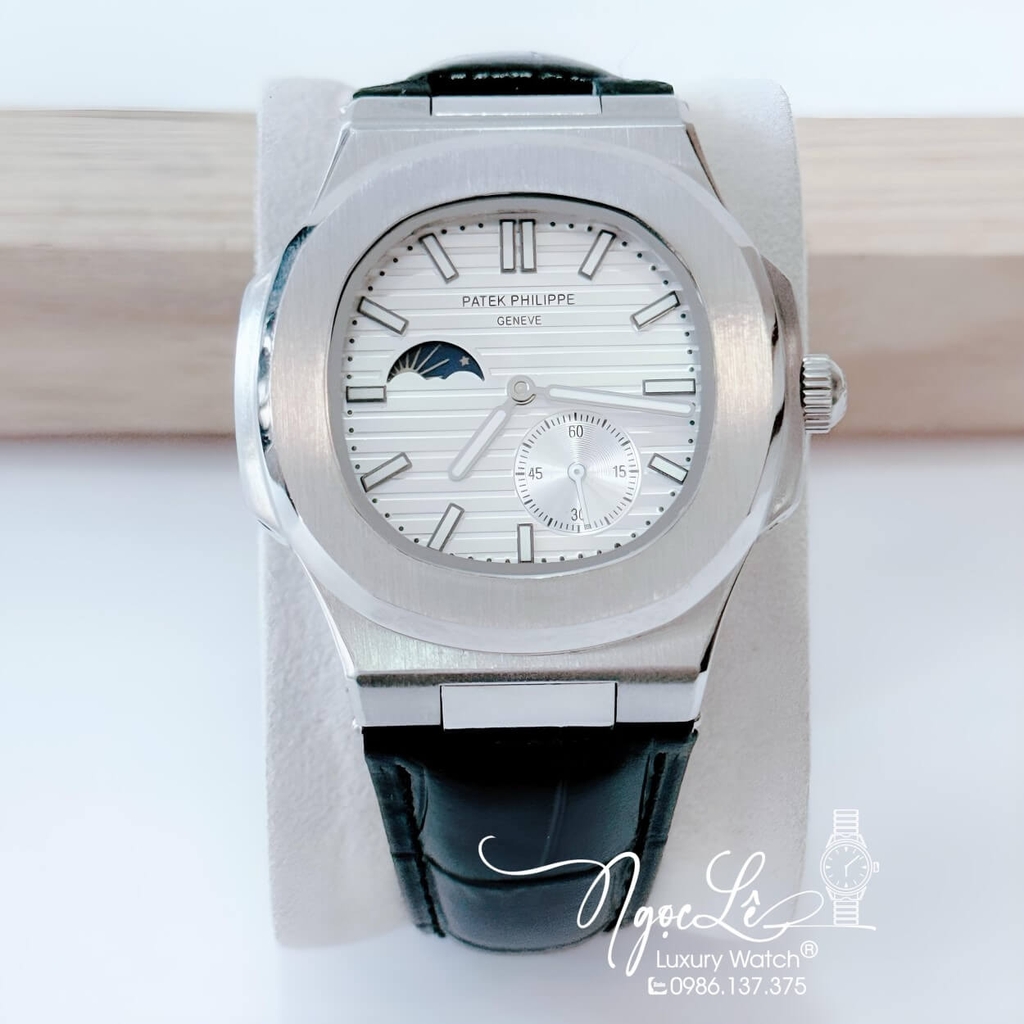 Đồng Hồ Nam Patek Philippe Nautilus Tự Động Dây Da Đen Mặt Trắng Niềng Trơn Size 40mm