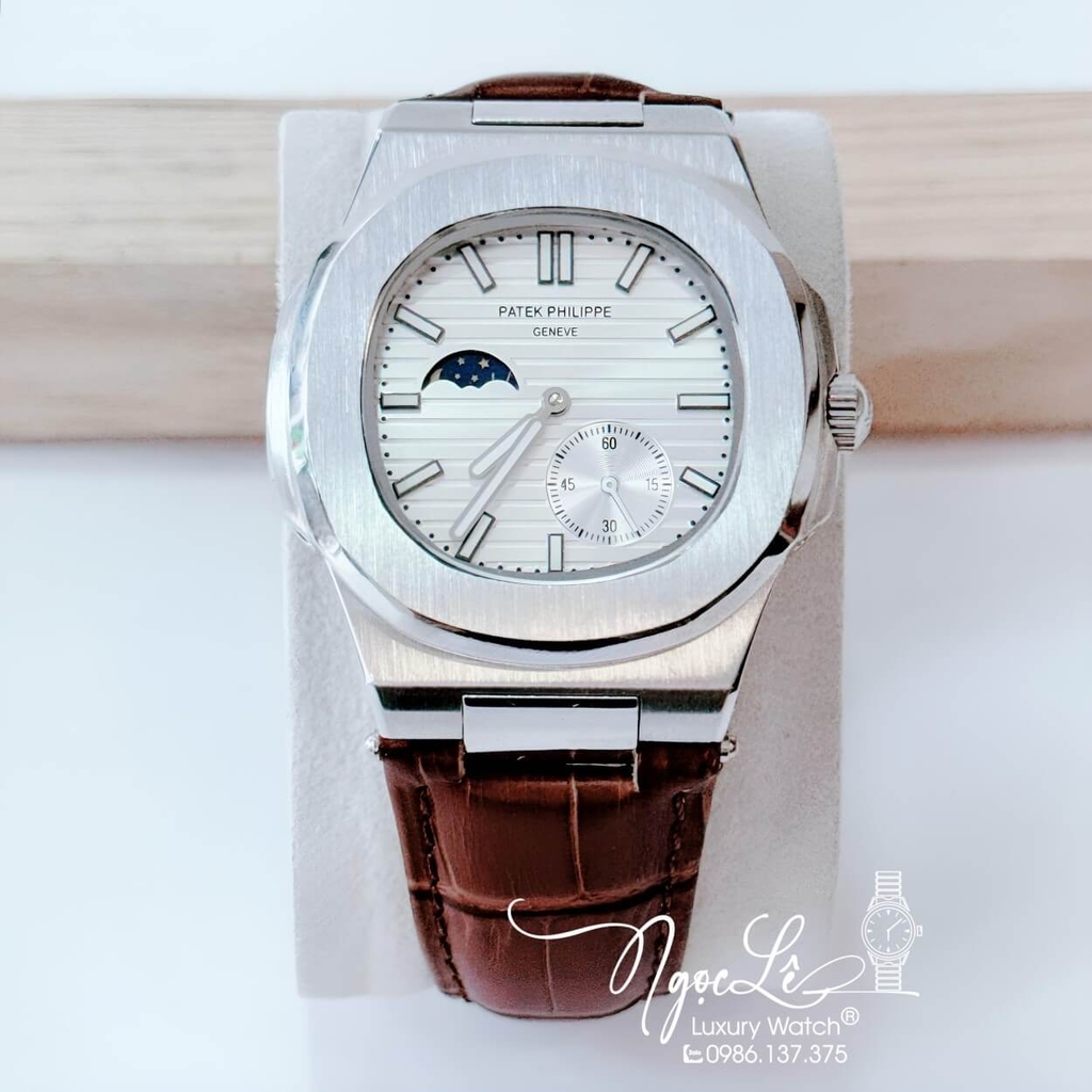 Đồng Hồ Nam Patek Philippe Nautilus Tự Động Dây Da Nâu Mặt Trắng Niềng Trơn Size 40mm