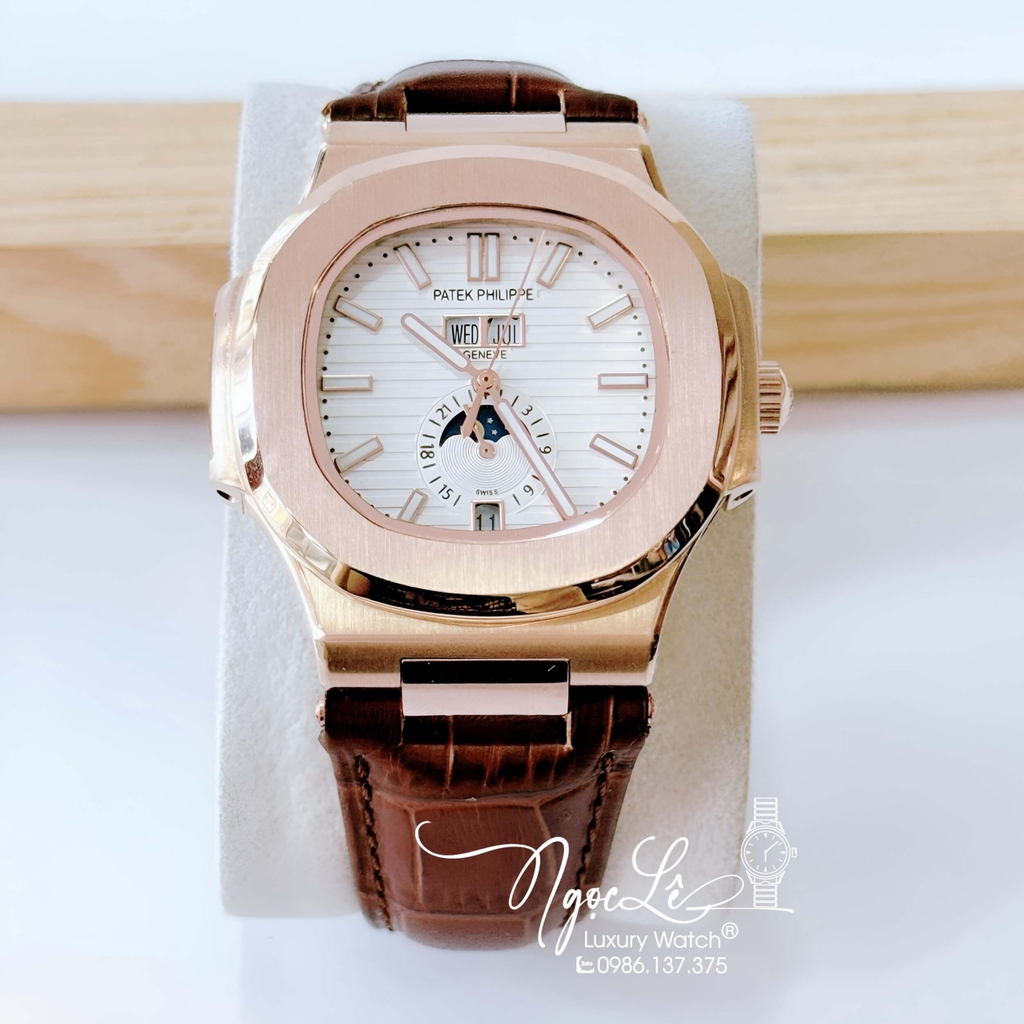 Đồng Hồ Nam Patek Philippe Nautilus Tự Động Dây Da Nâu Mặt Trắng Vỏ Rose Size 40mm
