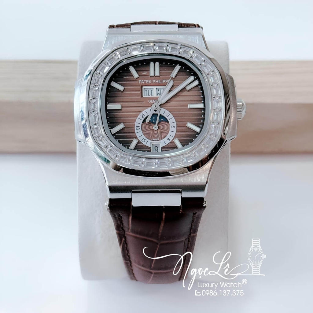 Đồng Hồ Nam Patek Philippe Nautilus Tự Động Dây Da Nâu Vỏ Bạc Đính Đá Size 40mm