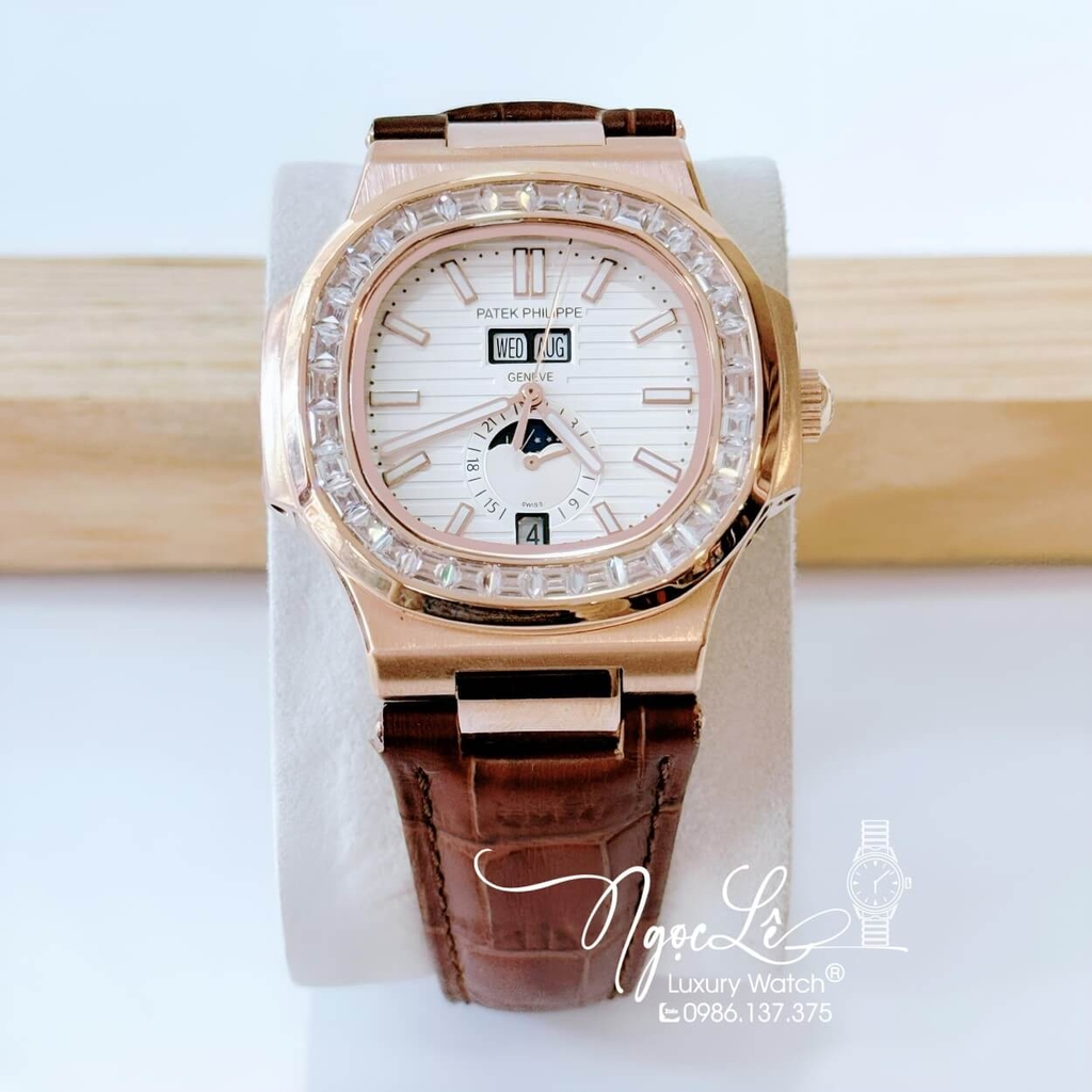 Đồng Hồ Nam Patek Philippe Nautilus Tự Động Dây Da Nâu Vỏ Rose Đính Đá Size 40mm
