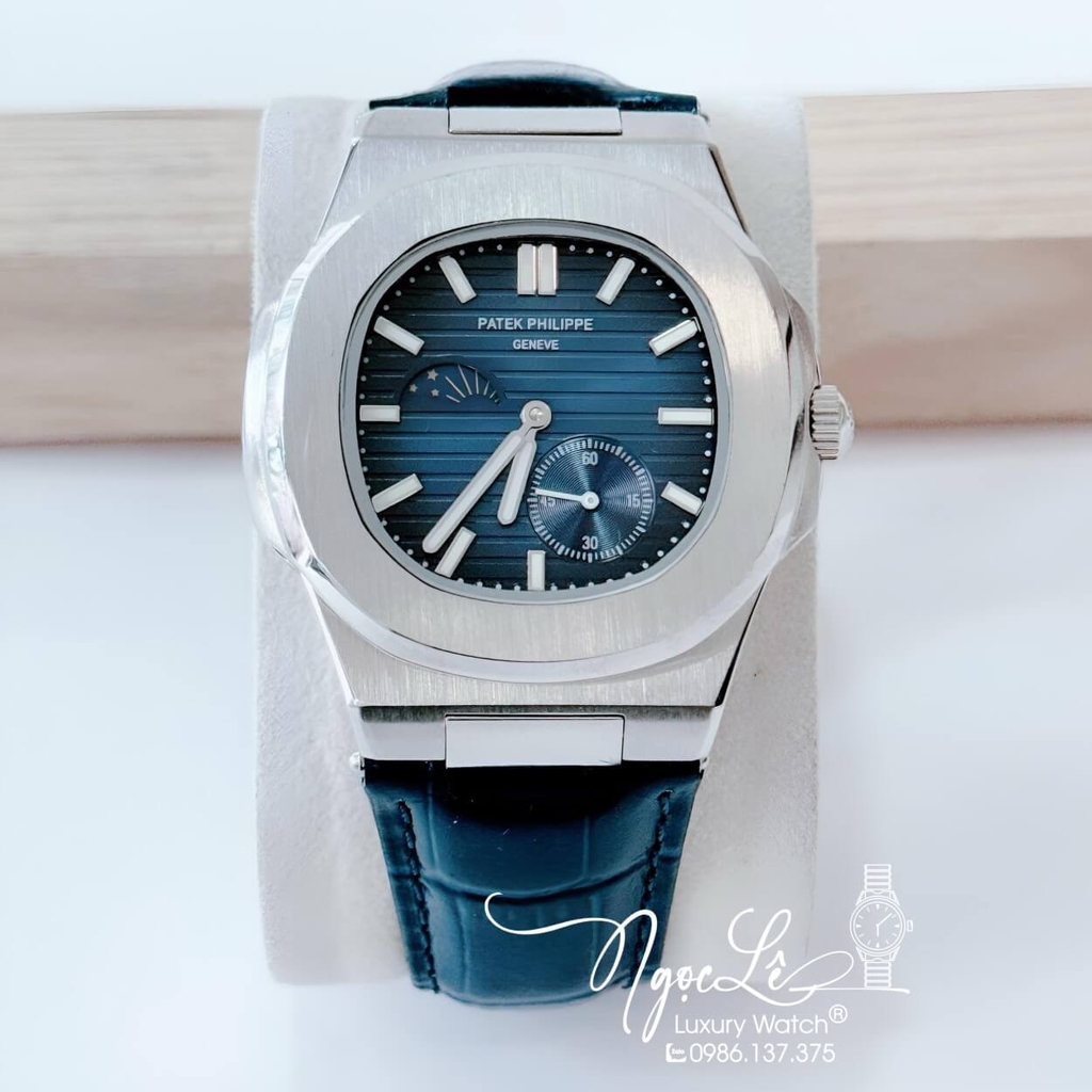Đồng Hồ Nam Patek Philippe Nautilus Tự Động Dây Da Xanh Dương Silver Niềng Trơn Size 40mm