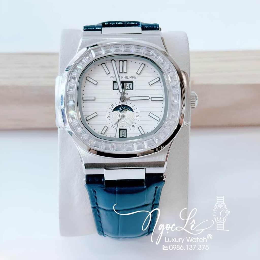 Đồng Hồ Nam Patek Philippe Nautilus Tự Động Dây Da Xanh Dương Vỏ Bạc Đính Đá Size 40mm