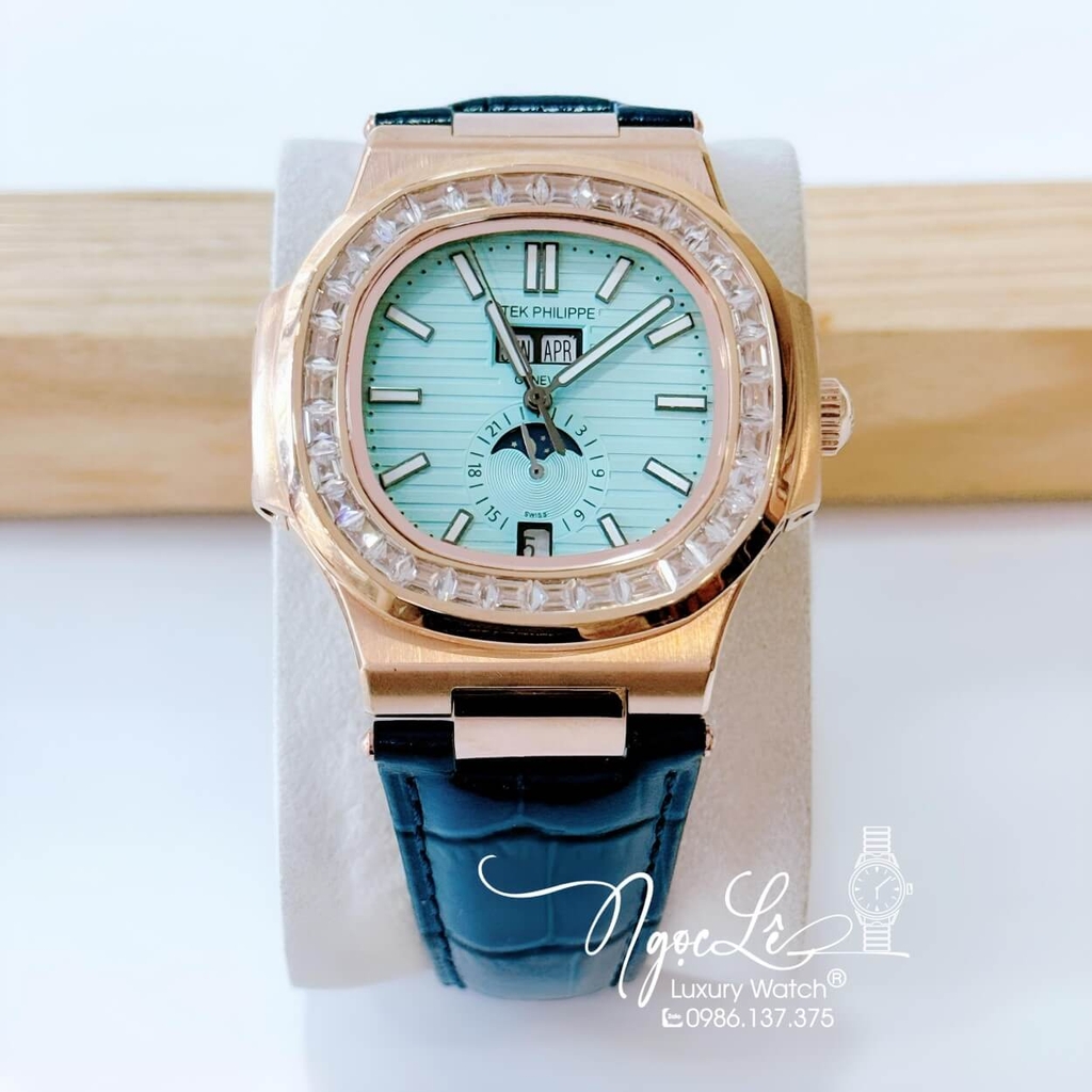 Đồng Hồ Nam Patek Philippe Nautilus Tự Động Dây Da Xanh Dương Vỏ Rose Đính Đá Size 40mm