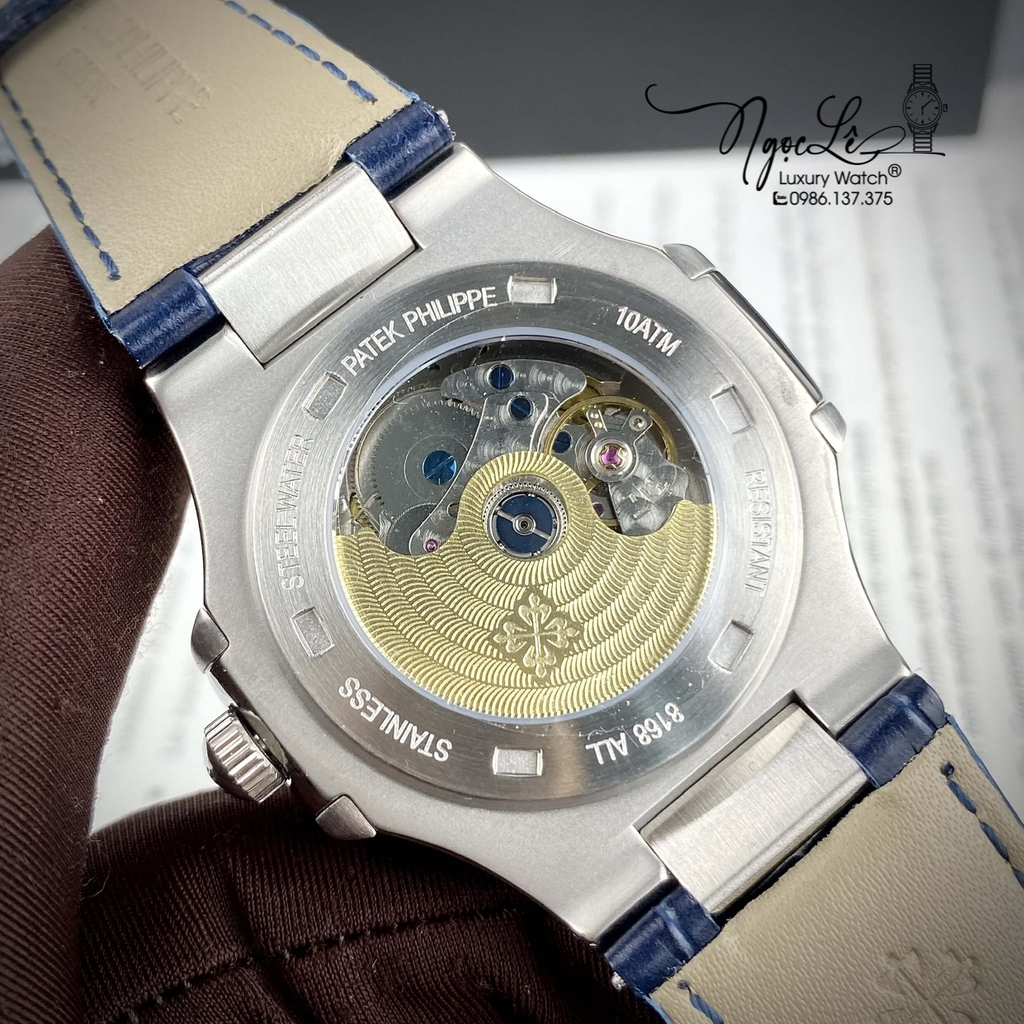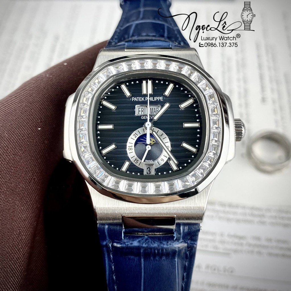 Hình ảnh Đồng Hồ Nam Patek Philippe Nautilus Tự Động Dây Da Xanh Mặt Xanh Đính Đá Silver Size 40mm