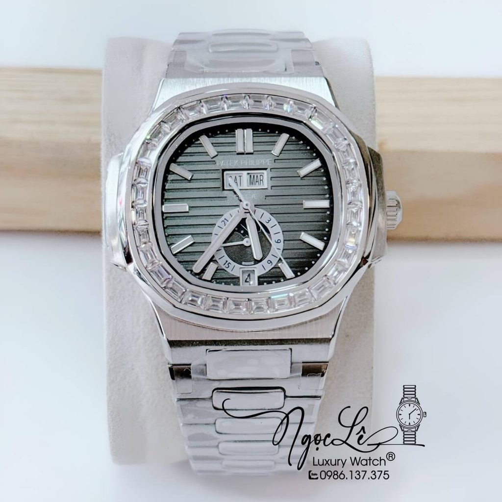 Đồng Hồ Nam Patek Philippe Nautilus Tự Động Dây Kim Loại Silver Mặt Xám Đính Đá Size 40mm