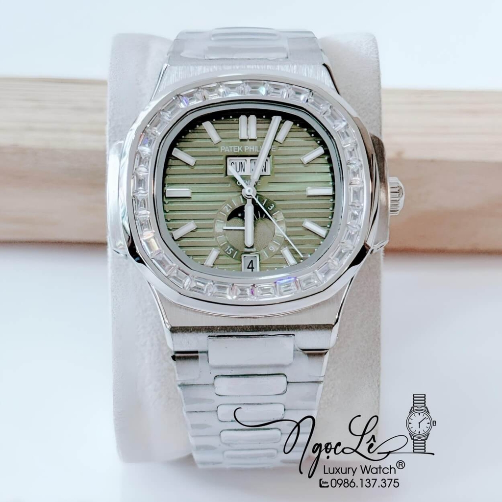 Đồng Hồ Nam Patek Philippe Nautilus Tự Động Dây Kim Loại Silver Mặt Xanh Rêu Đính Đá Size 40mm