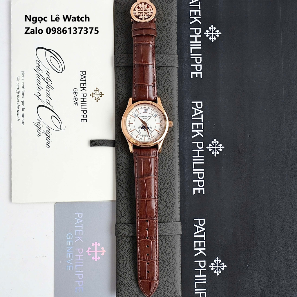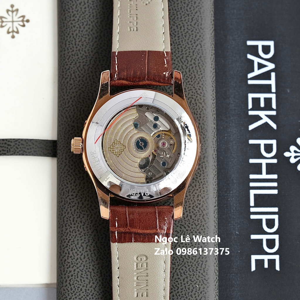 Đồng Hồ Nam Patek Philippe Tự Động Dây Da Nâu Mặt Trắng Size 40mm - Vỏ Rose Gold