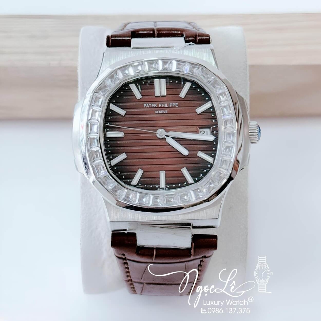 Đồng Hồ Nam Patek Philippe Tự Động Dây Da Nâu Vỏ Silver Đính Đá Size 40mm