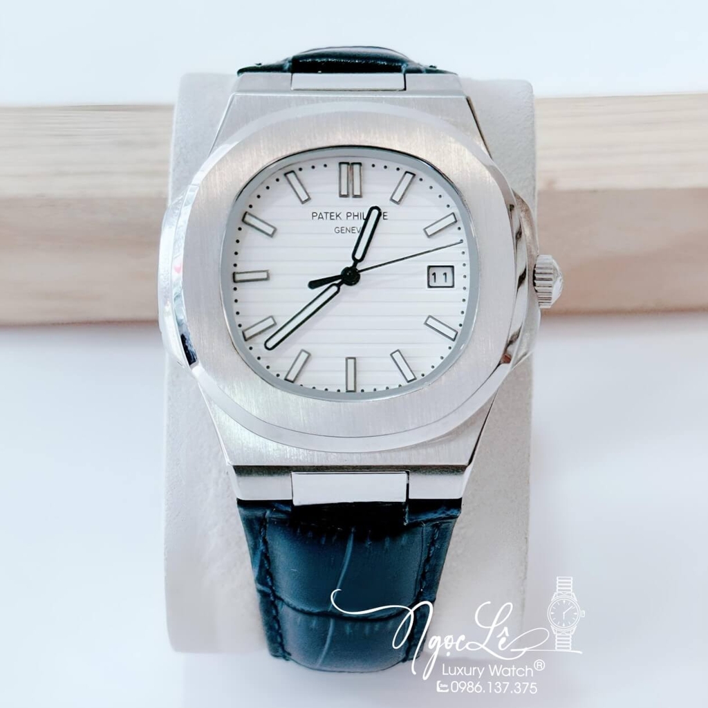 Đồng Hồ Nam Patek Philippe Tự Động Dây Da Xanh Dương Mặt Trắng Silver Niềng Trơn Size 40mm