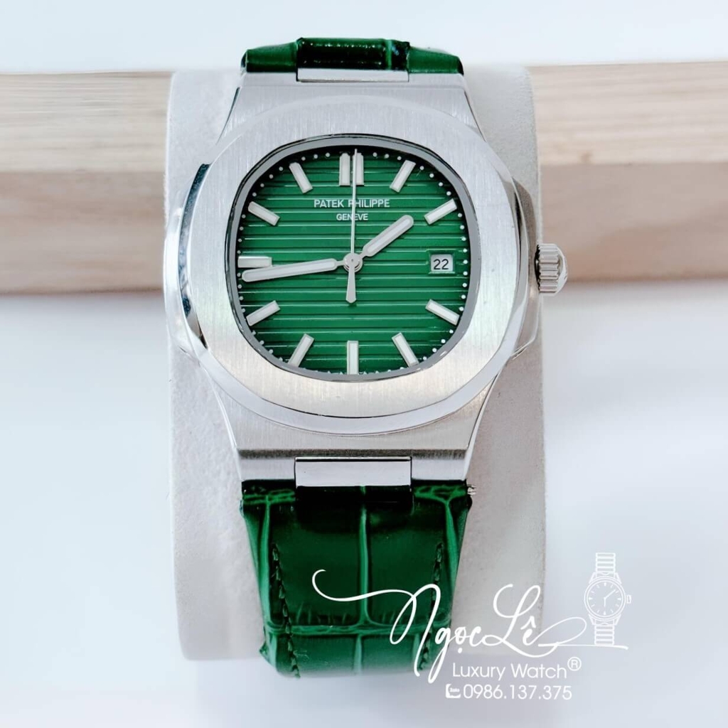 Đồng Hồ Nam Patek Philippe Tự Động Dây Da Xanh Lá Vỏ Silver Niềng Trơn Size 40mm
