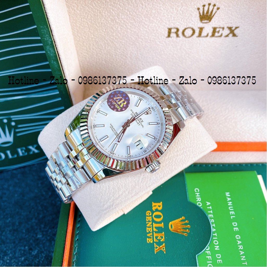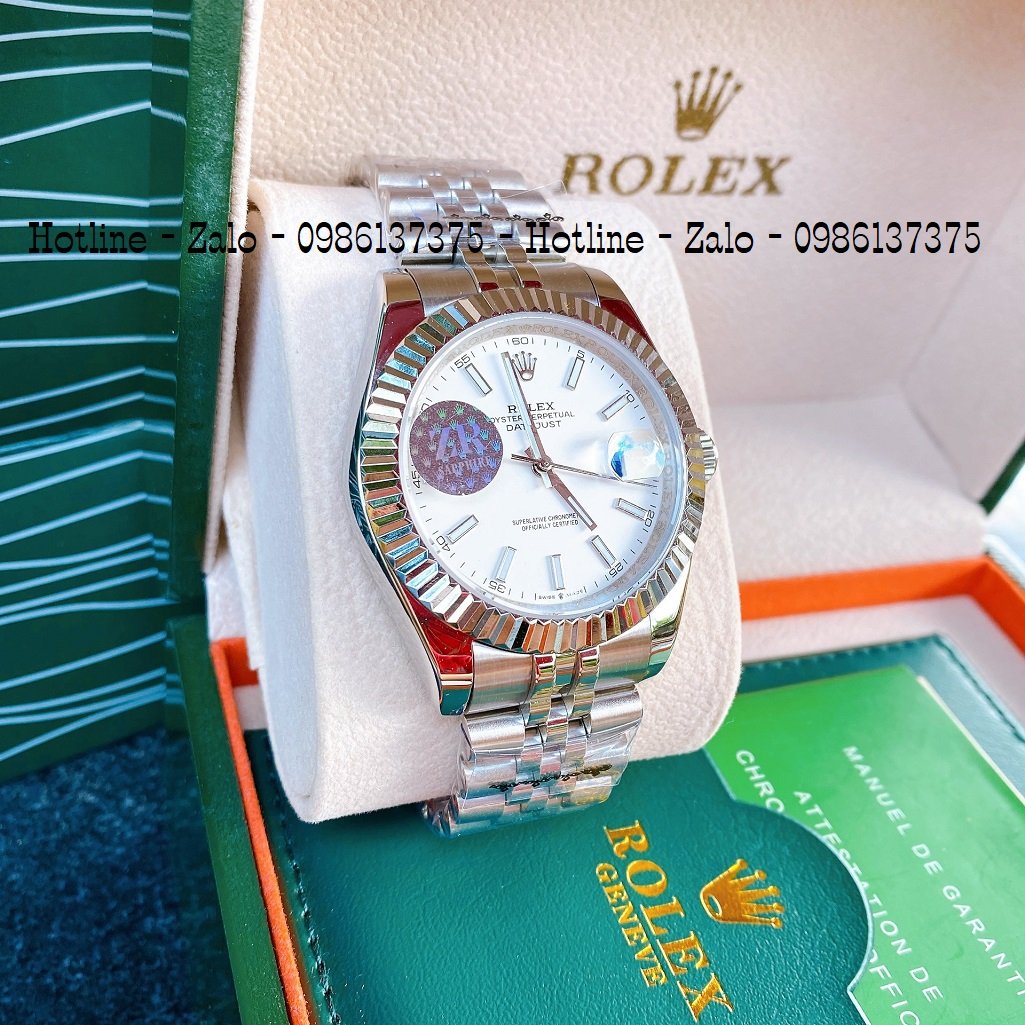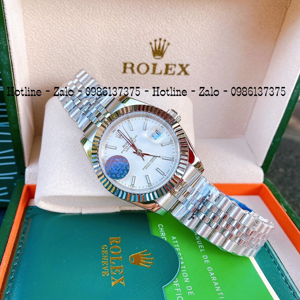 Đồng Hồ Nam Rolex Automatic 1 Lịch Viền Khía Bạc Trắng 41mm