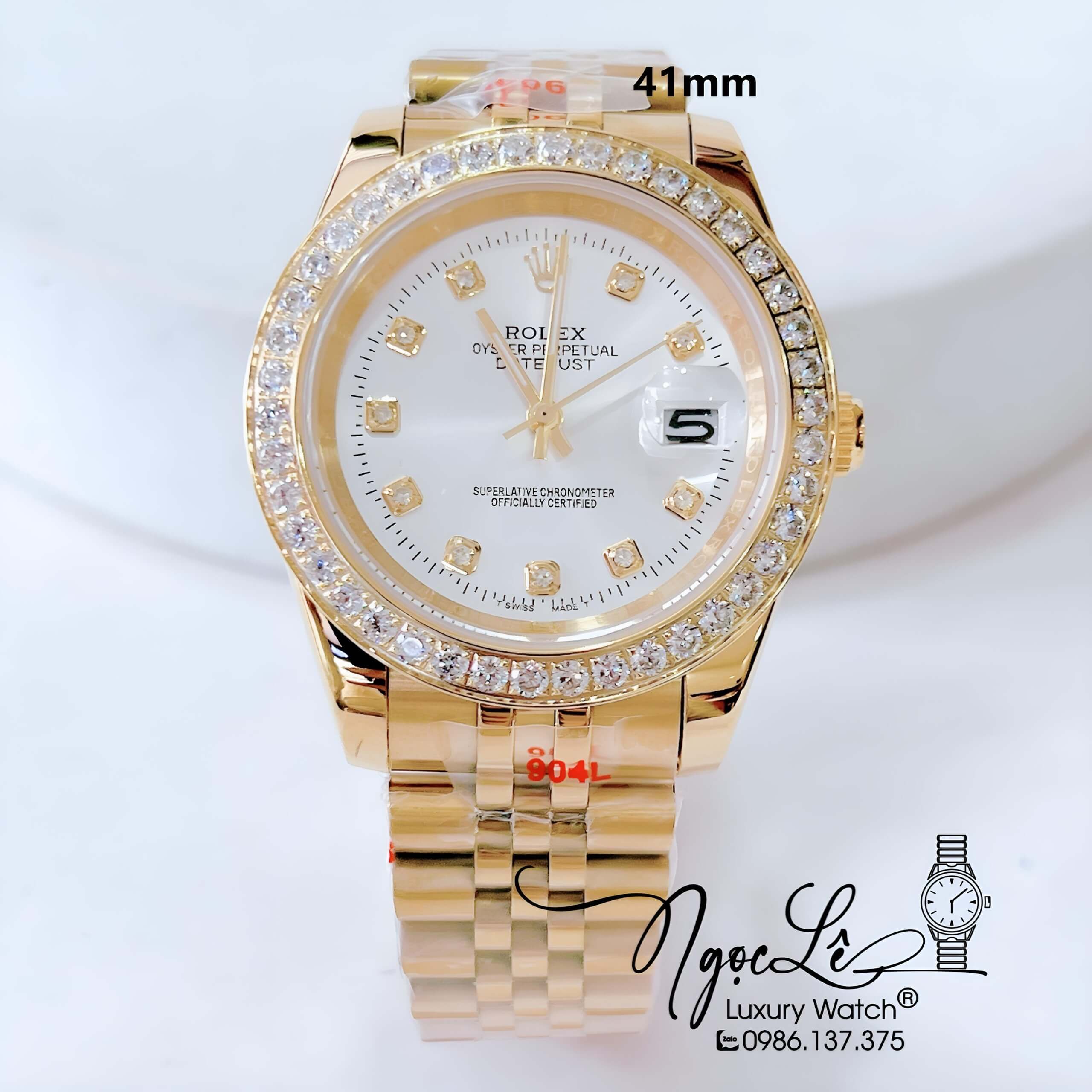 Đồng Hồ Nam Rolex Datejust Pin Màu Vàng Mặt Trắng Đính Đá Size 41mm