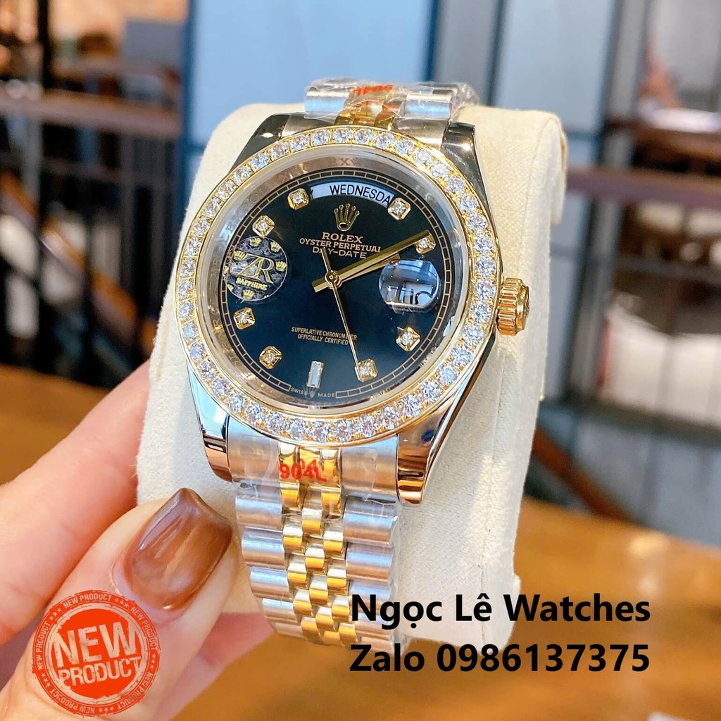 Rolex Day-Date Automatic phiên bản dây demi vàng sang trọng, kết hợp mặt đen huyền bí và viền đính đá tinh xảo, mang đến khí chất quyền lực cho phái mạnh. Mẫu đồng hồ vừa thể hiện đẳng cấp, vừa là điểm nhấn phong cách trong mọi hoàn cảnh.