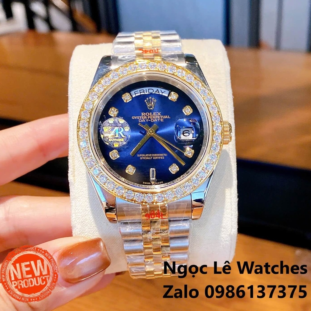 Rolex Day-Date Automatic phiên bản mặt xanh ombre độc đáo, kết hợp dây demi vàng sang trọng và viền đính đá tinh tế. Đây là mẫu đồng hồ dành cho quý ông yêu thích sự nổi bật, lịch lãm nhưng vẫn giữ nét quyền lực.