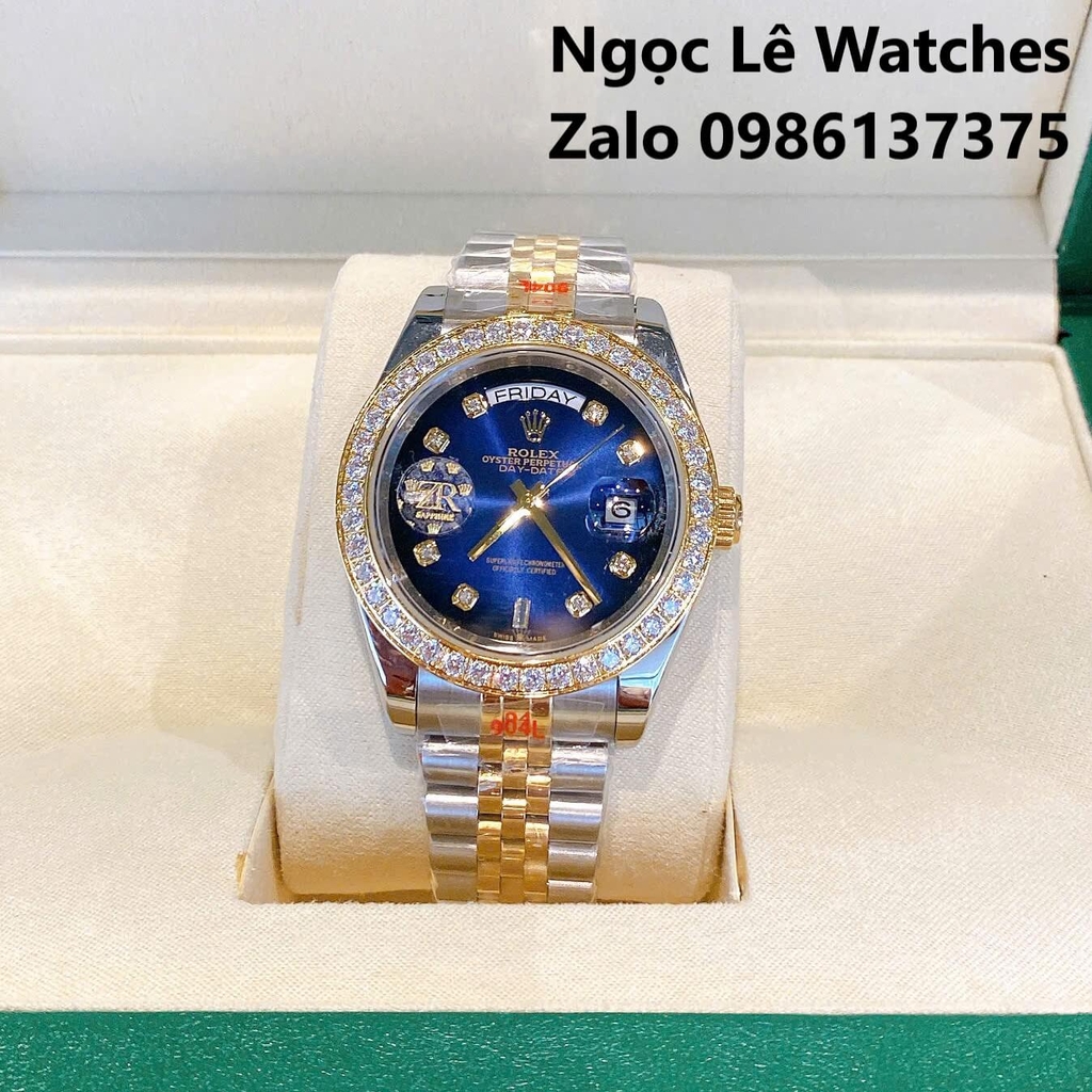 Hình ảnh Đồng Hồ Nam Rolex Day-Date Tự Động Dây Kim Loại Demi Vàng Mặt Xanh Ombre Size 41mm Viền Đính Đá