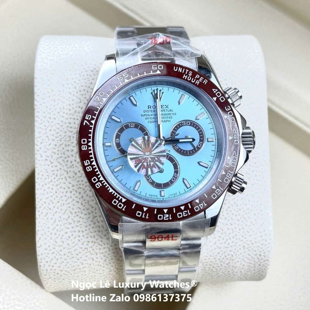 Mẫu Rolex Daytona Automatic dây kim loại silver mặt xanh viền nâu mang phong cách thể thao – sang trọng. Thiết kế 3 mặt số phụ cùng vạch chỉ giờ & kim phản quang giúp tăng khả năng hiển thị và tạo điểm nhấn hiện đại, cuốn hút cho cổ tay phái mạnh.
