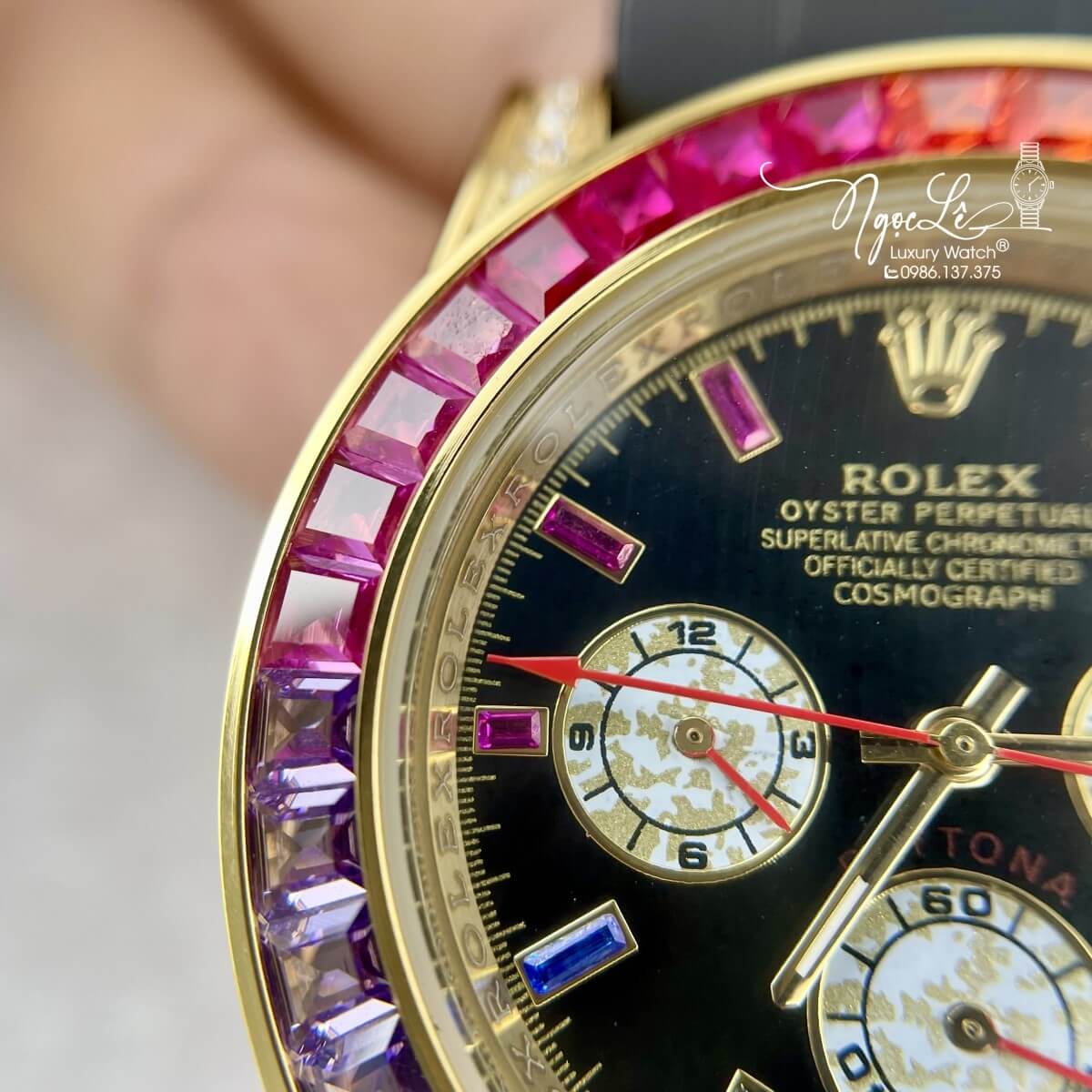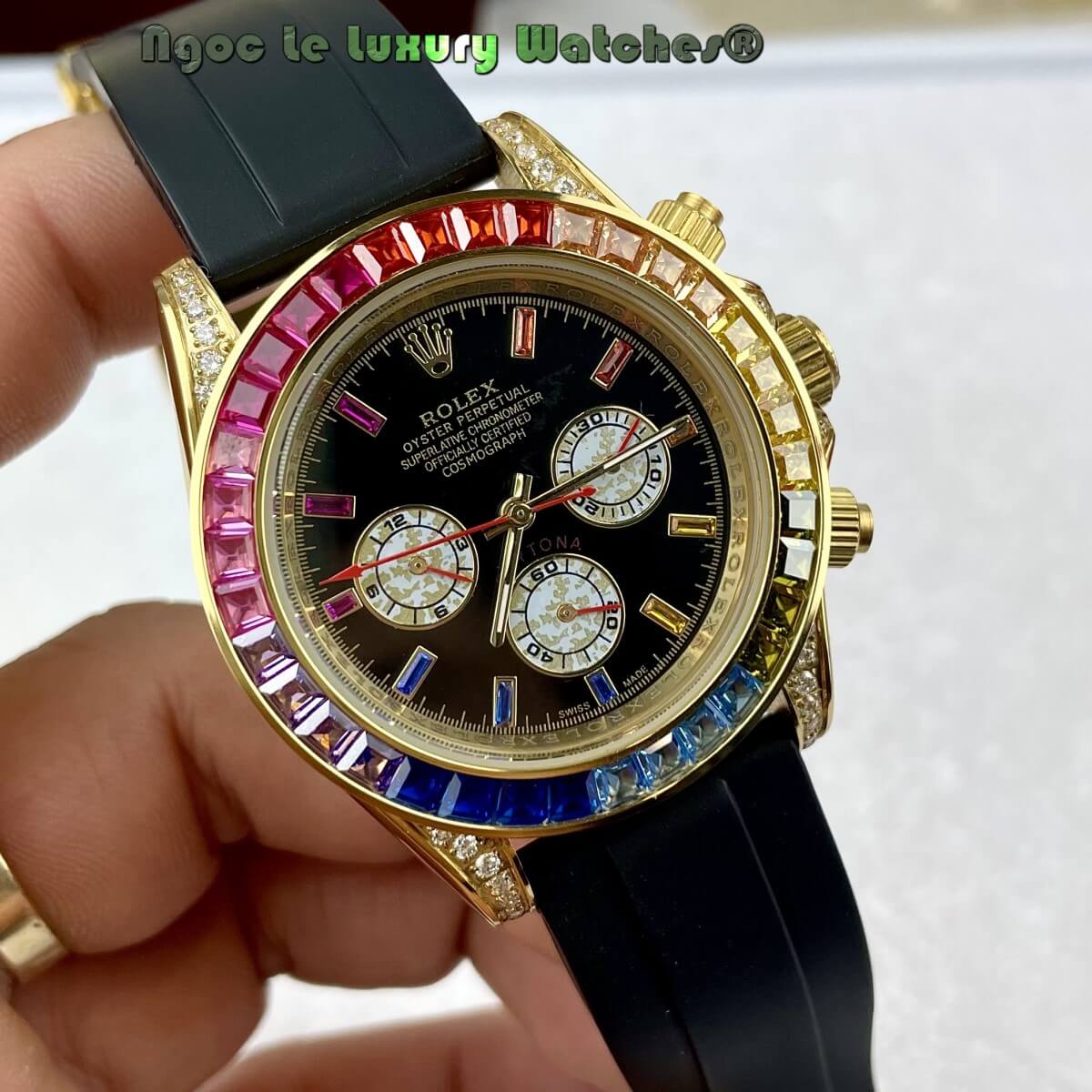 Hình ảnh thực tế Đồng Hồ Nam Rolex Daytona Rainbow Automatic Dây Silicon Đen Vỏ Vàng Size 40mm