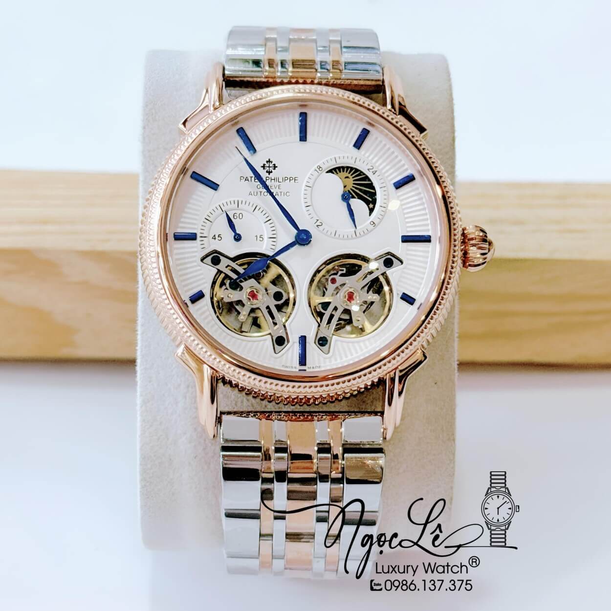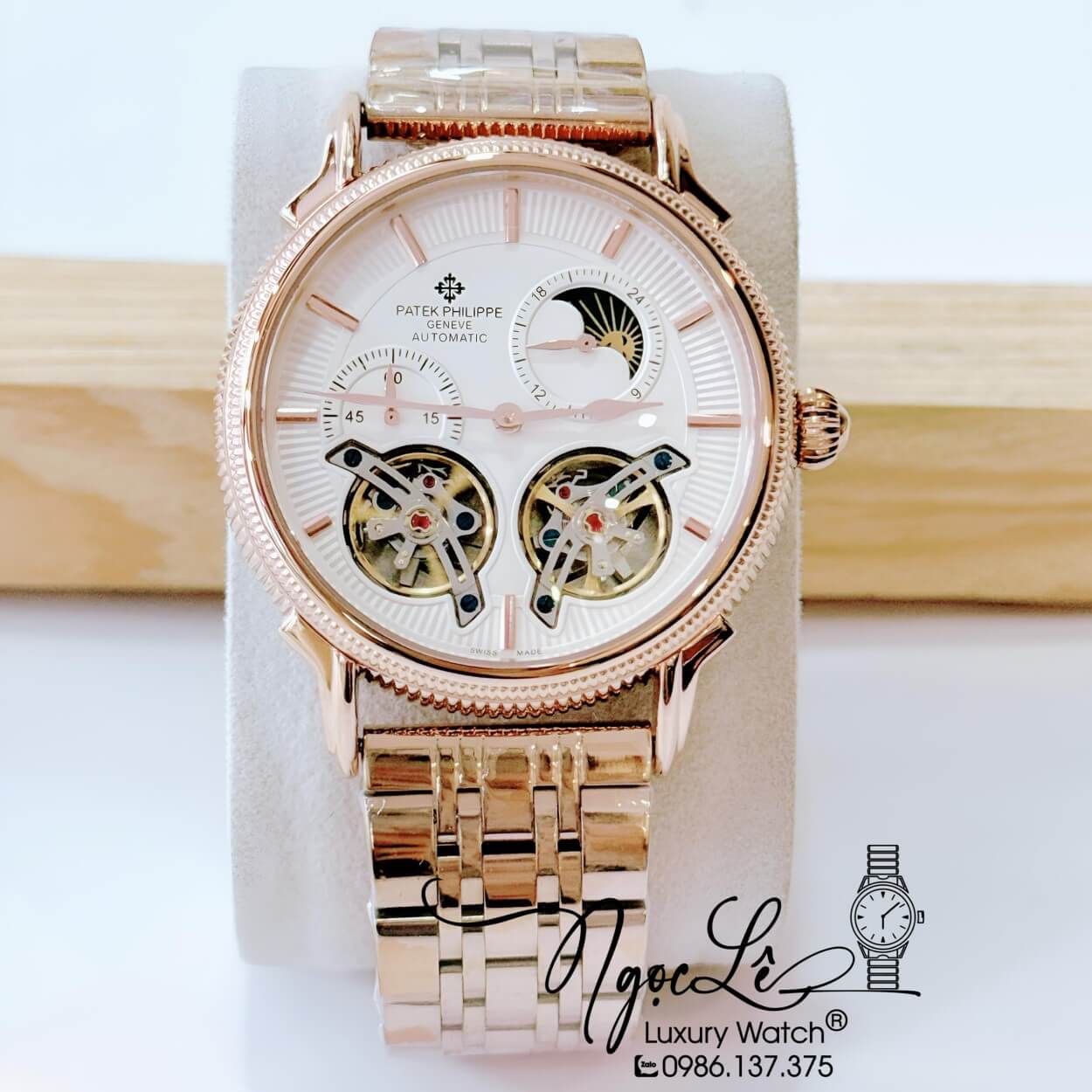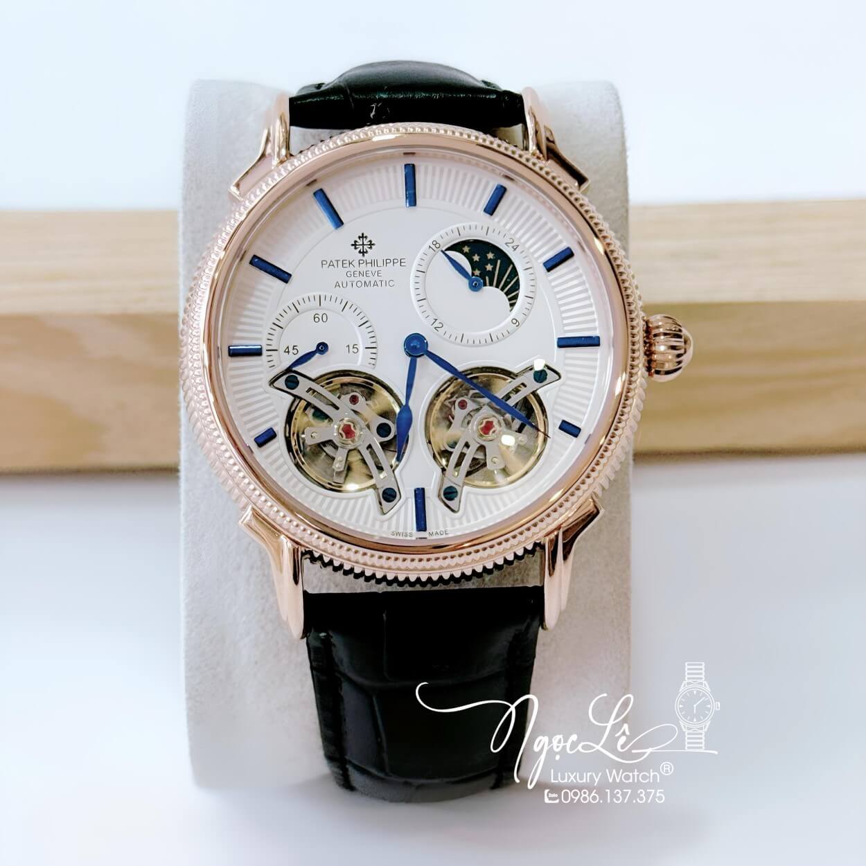 Đồng Hồ Nam Patek Philippe Tự Động Dây Da Đen Mặt Trắng Vỏ Rose Size 42mm