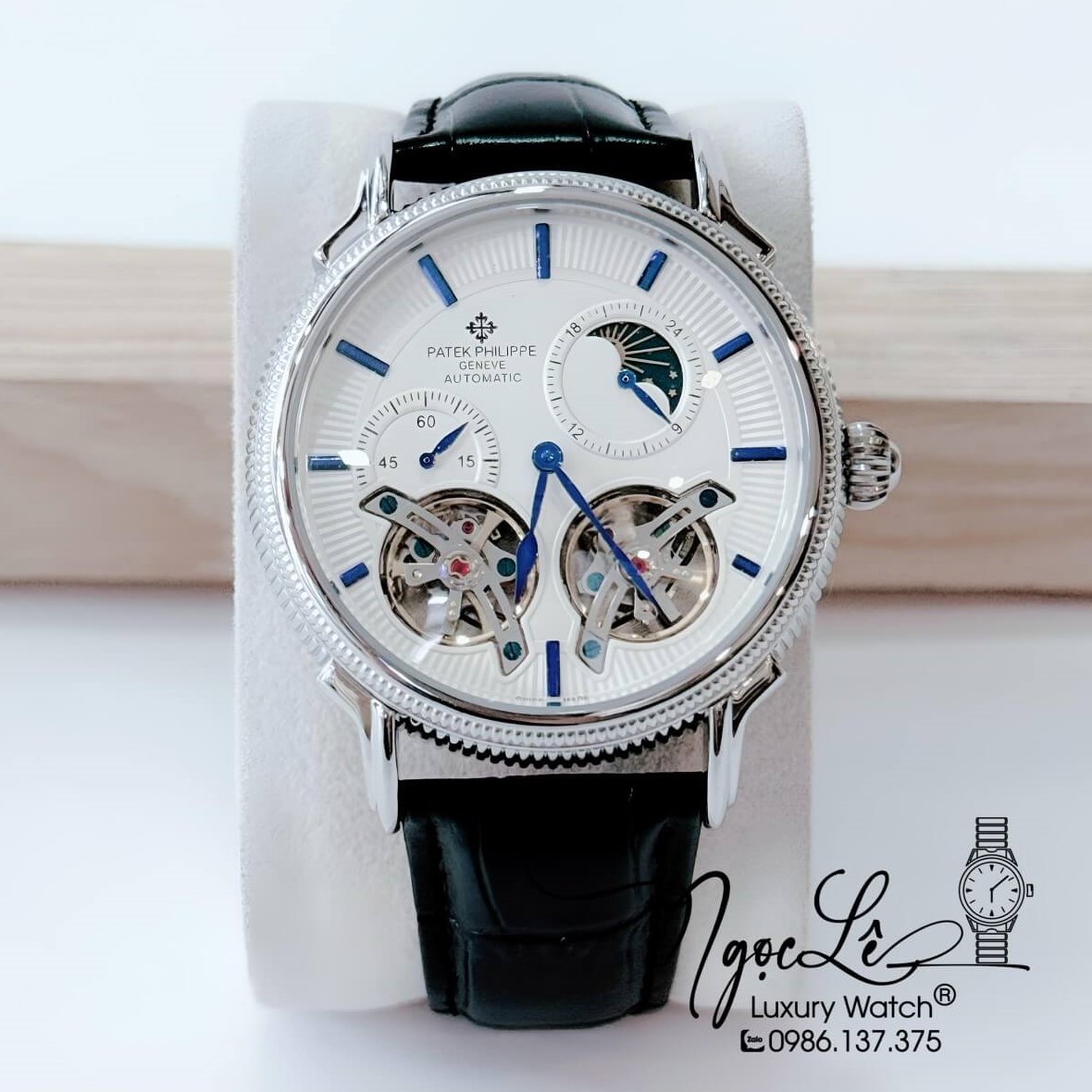Đồng Hồ Nam Patek Philippe Tự Động Dây Da Đen Mặt Trắng Vỏ Silver Size 42mm