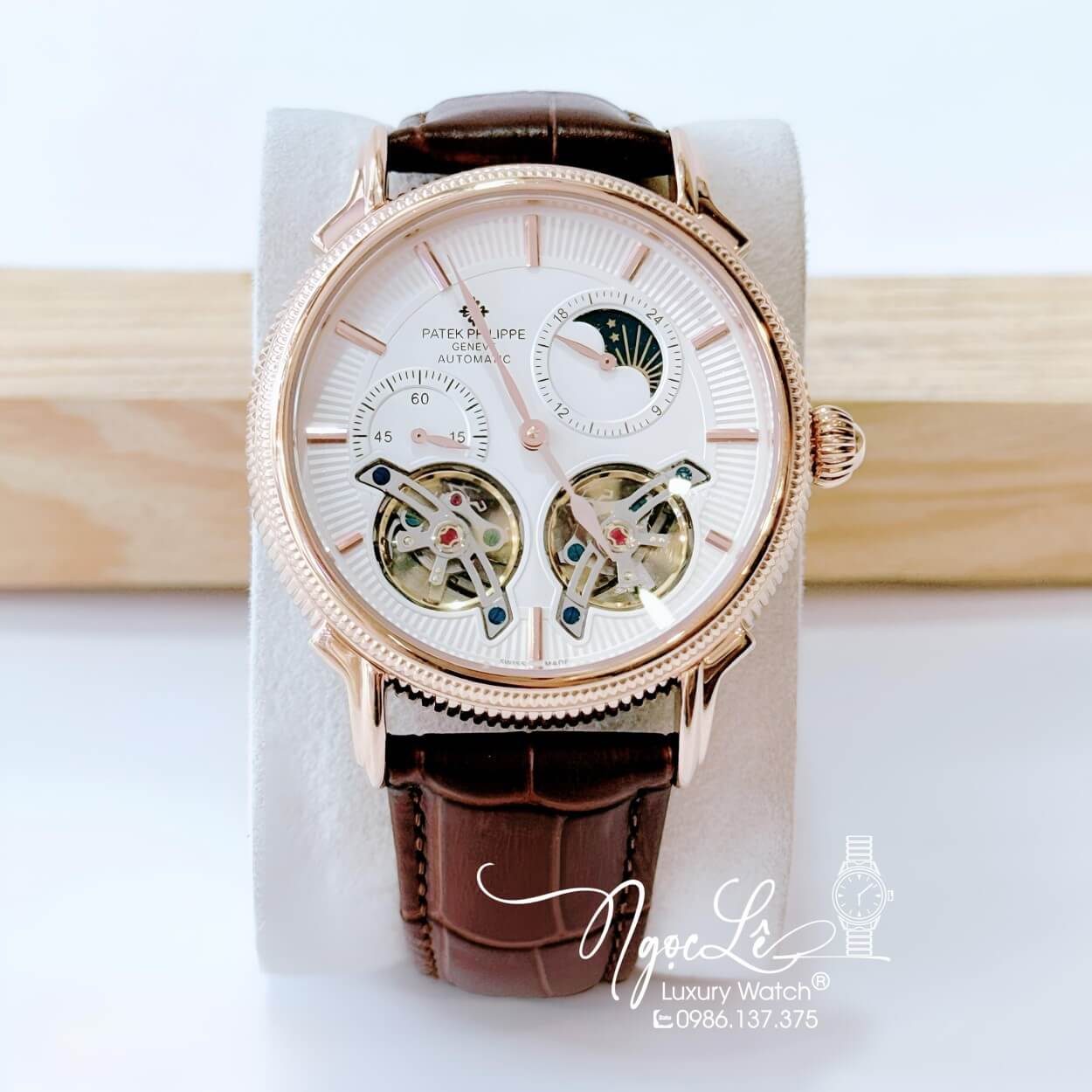 Đồng Hồ Nam Patek Philippe Tự Động Dây Da Nâu Mặt Trắng Vỏ Rose Size 42mm