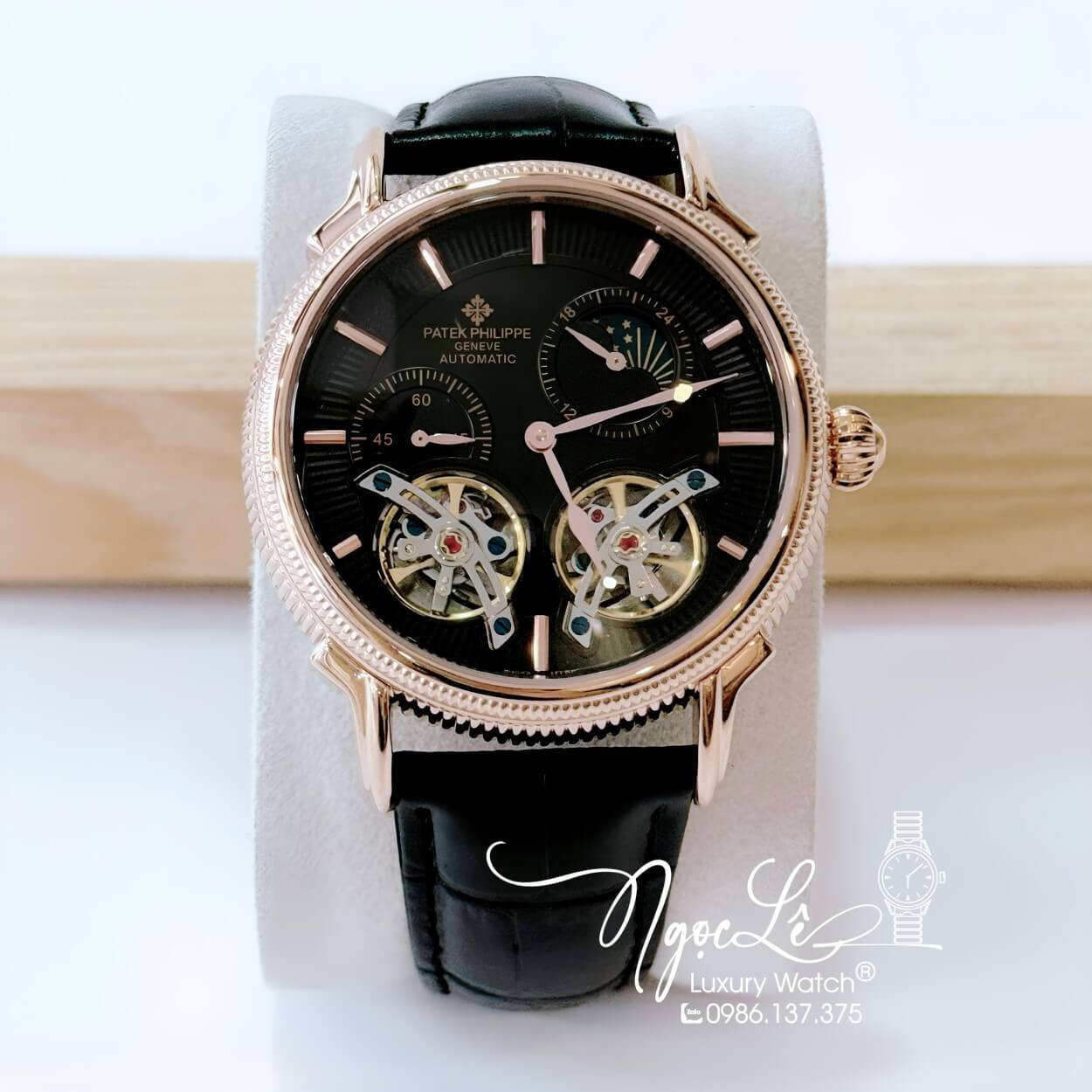 Đồng Hồ Nam Patek Philippe Tự Động Dây Da Đen Mặt Đen Vỏ Rose Size 42mm
