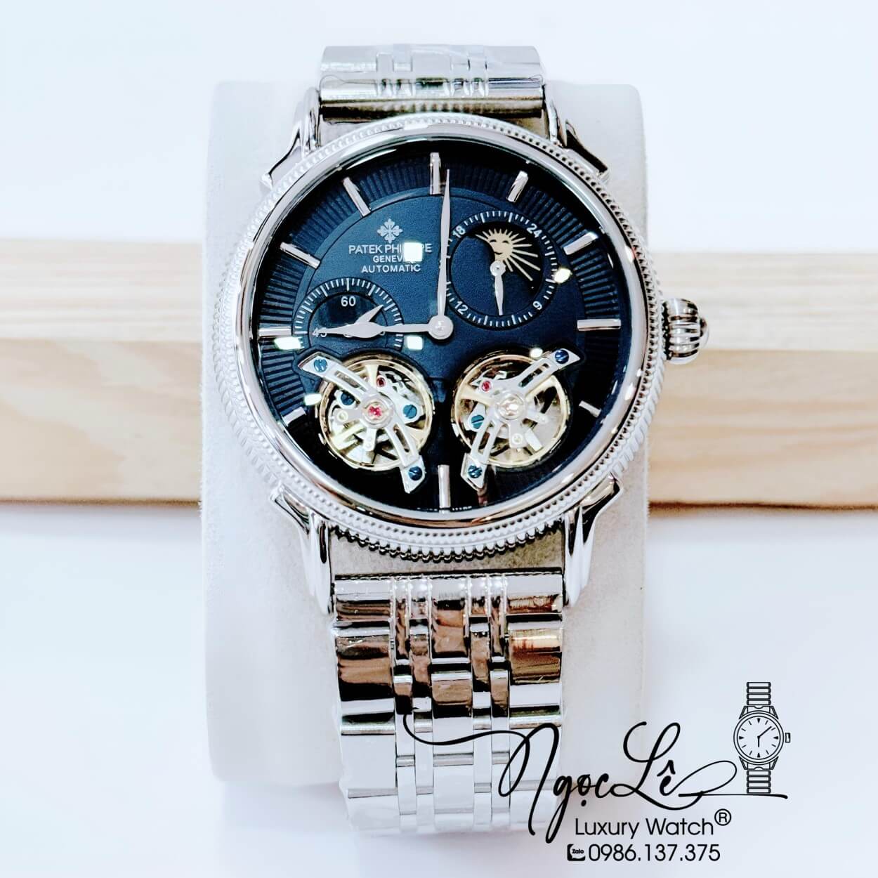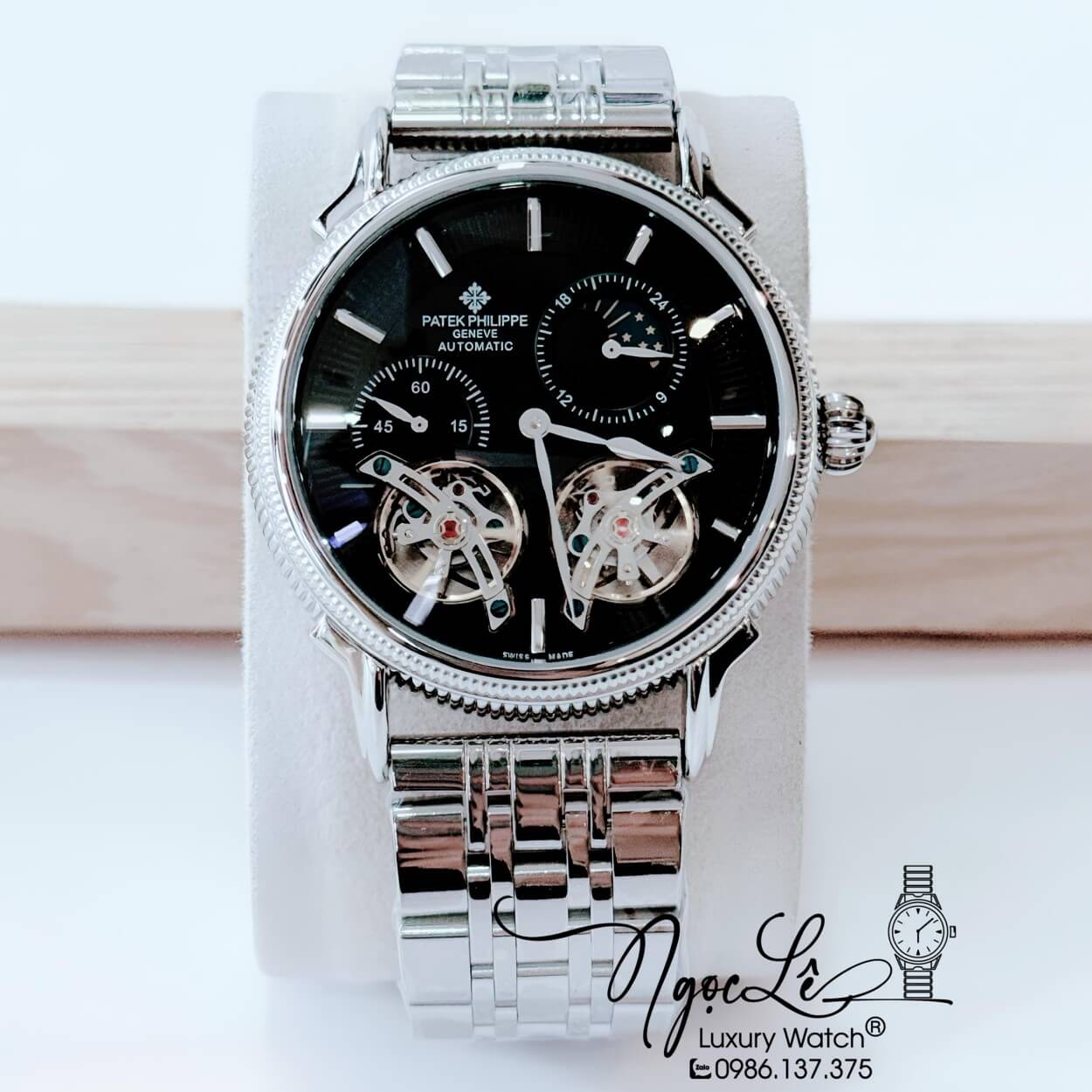Đồng Hồ Nam Patek Philippe Tự Động Dây Kim Loại Bạc Mặt Đen Size 42mm