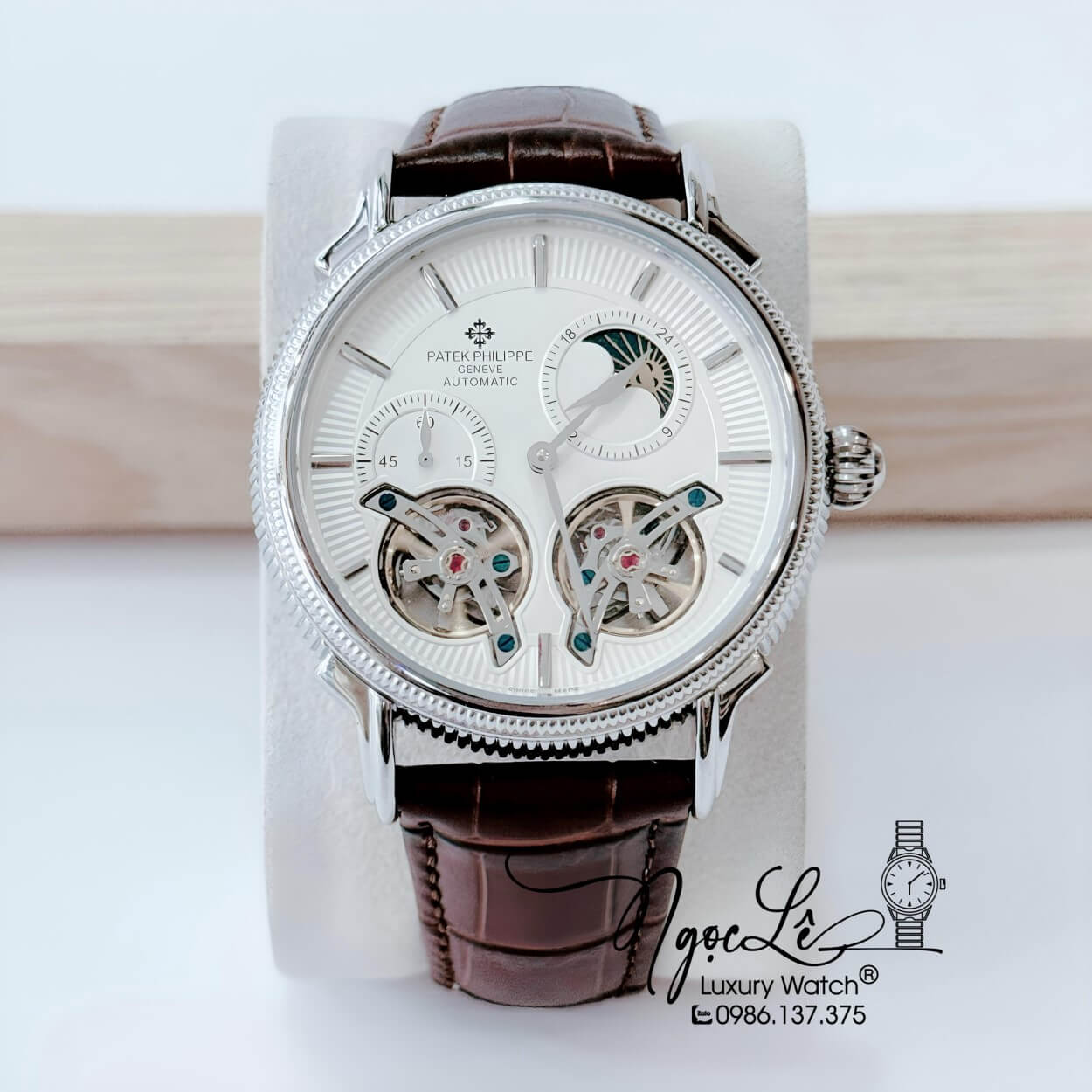 Đồng Hồ Nam Patek Philippe Tự Động Dây Da Nâu Mặt Trắng Vỏ Silver Size 42mm