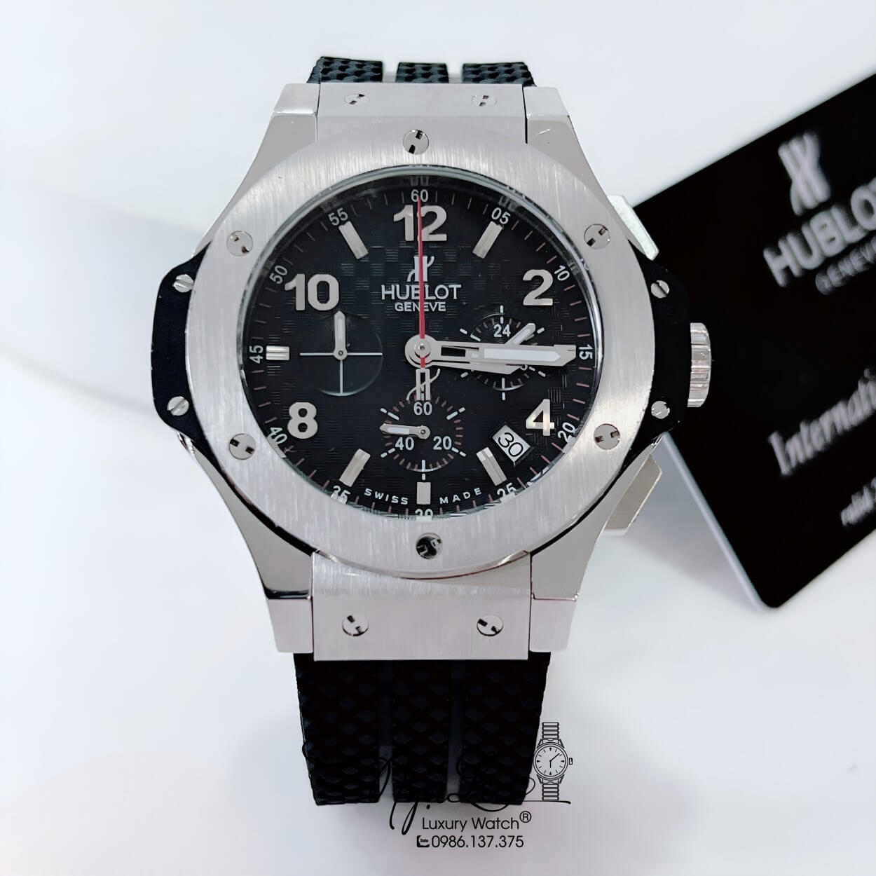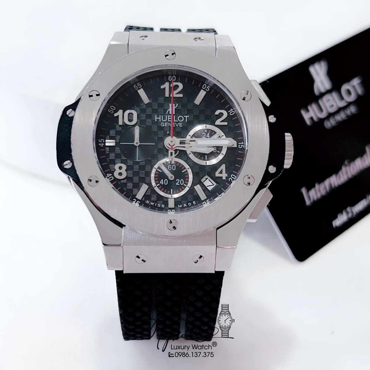 Đồng Hồ Hublot Big Bang Nam Máy Pin Dây Silicon Đen Vỏ Thép Bạc Mặt Đen Size 42mm