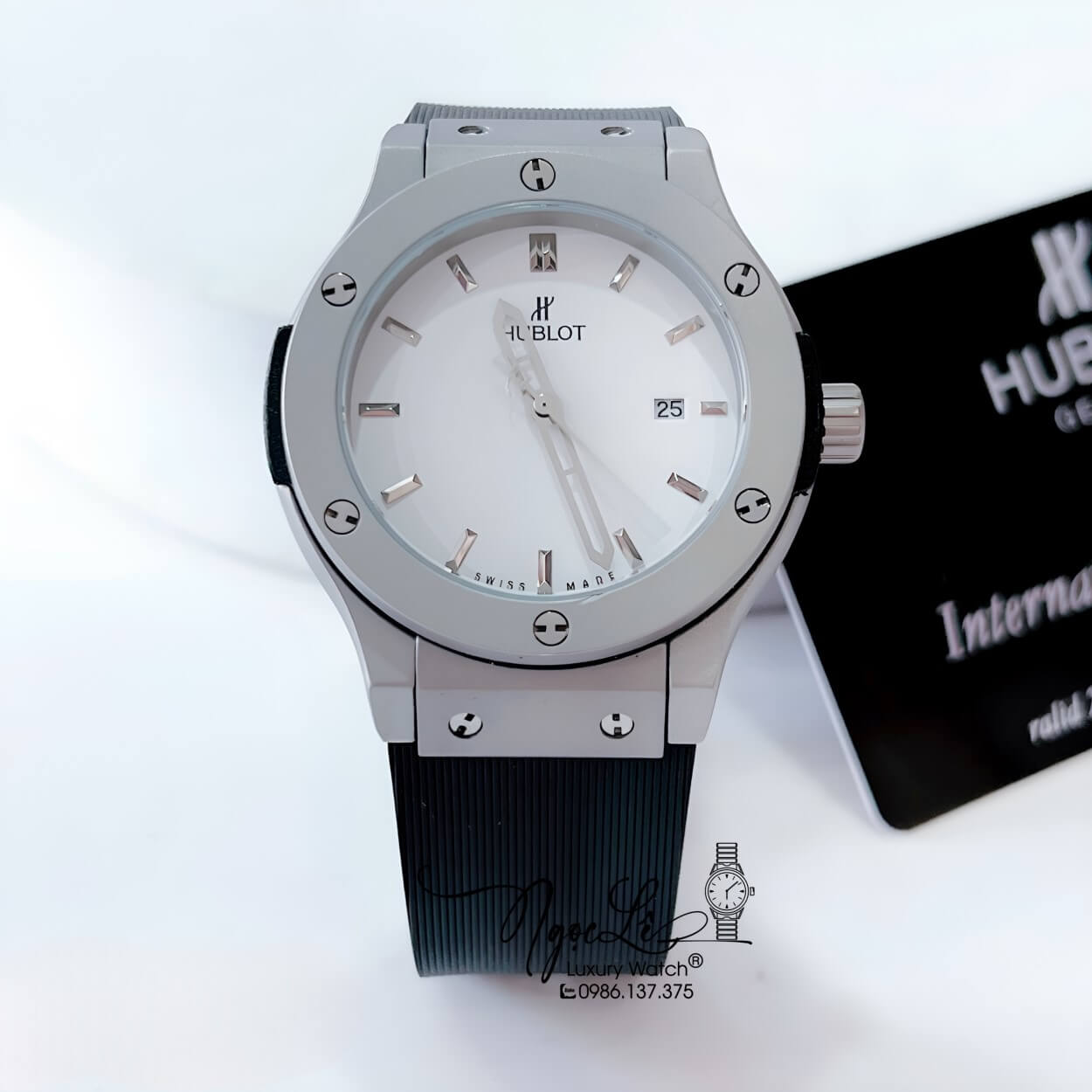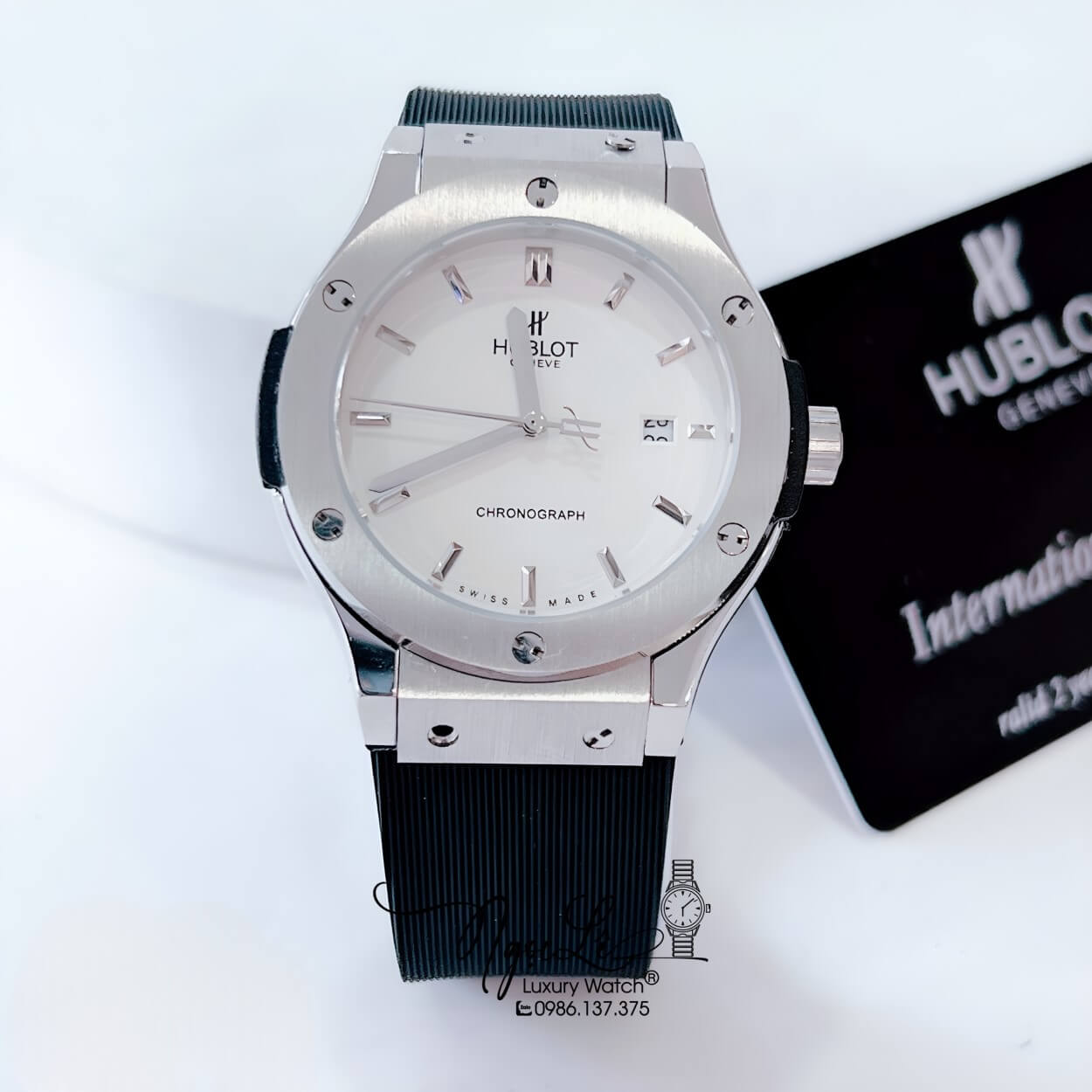 Đồng Hồ Hublot Classic Fusion Nam Máy Pin Dây Silicon Đen Mặt Trắng Vỏ Bạc Size 38mm