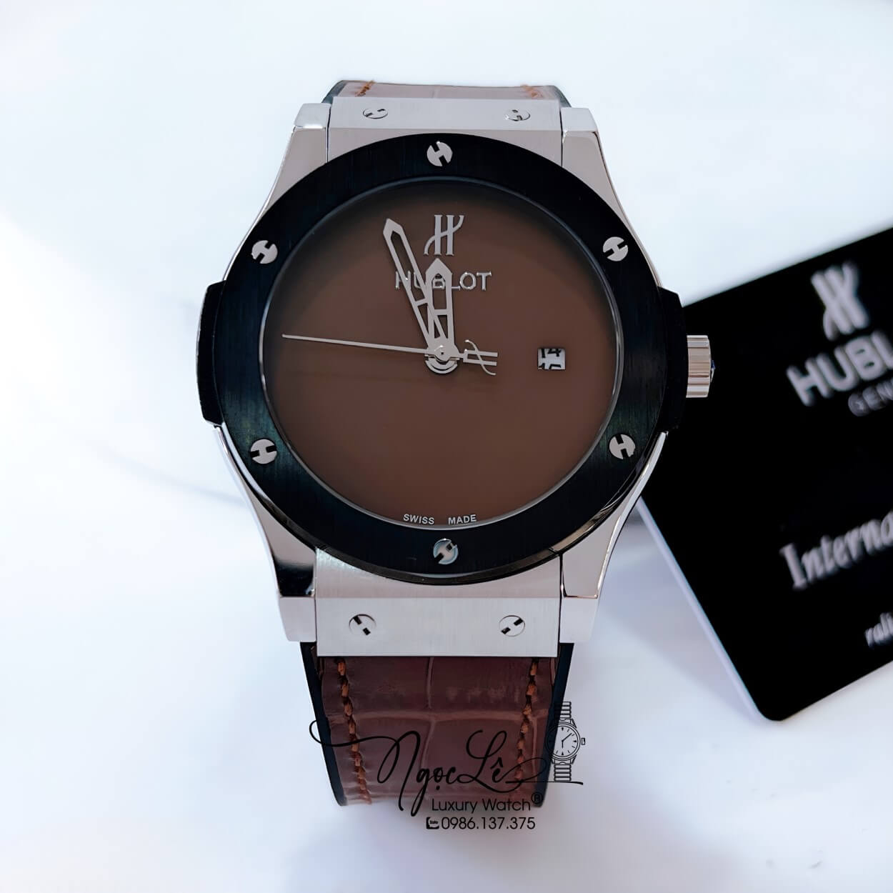 Đồng Hồ Hublot Classic Fusion Nam Máy Pin Dây Da Silicon Nâu Đậm Vỏ Thép Đen Size 42mm