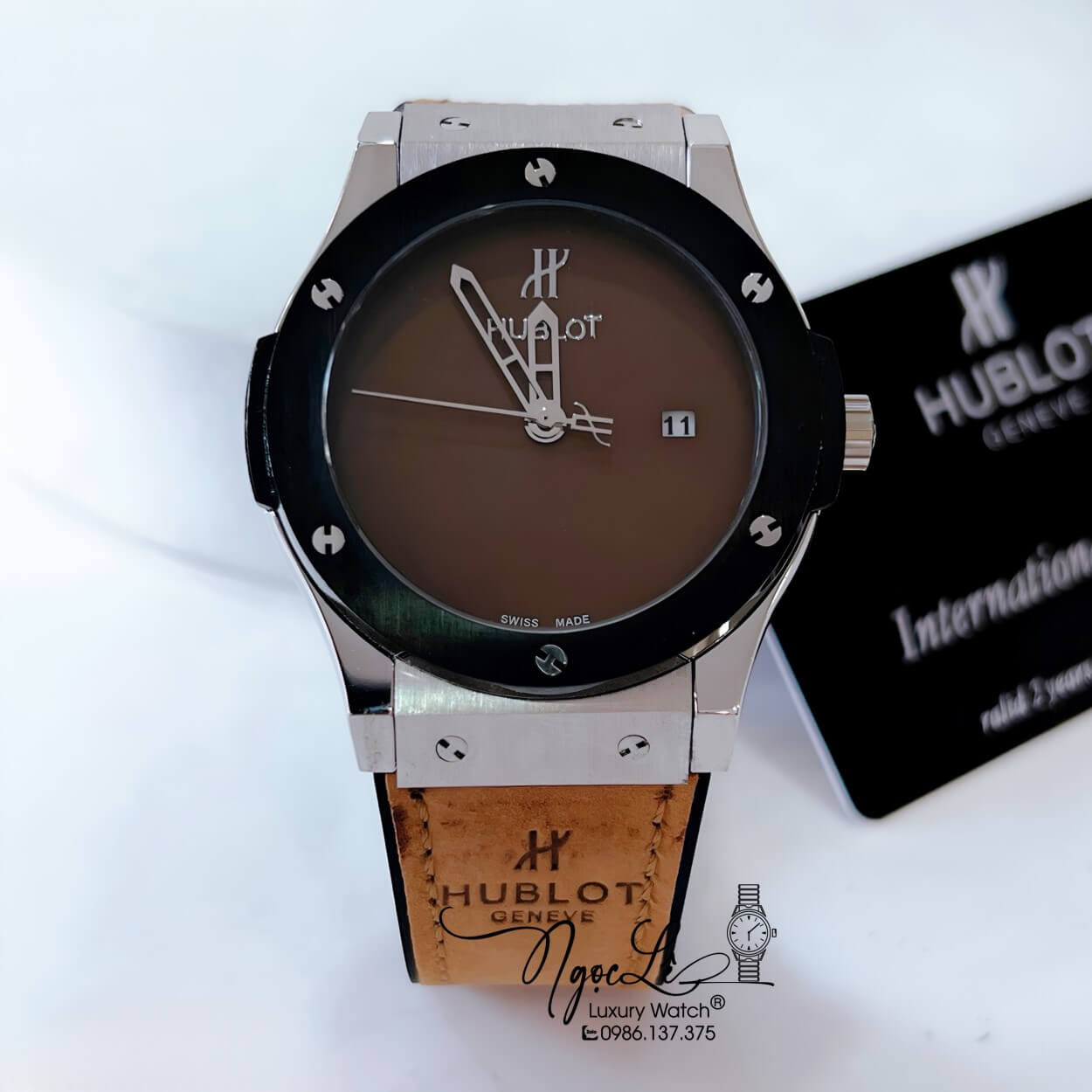 Đồng Hồ Hublot Classic Fusion Nam Máy Pin Dây Da Silicon Nâu Bò Vỏ Thép Đen Size 42mm