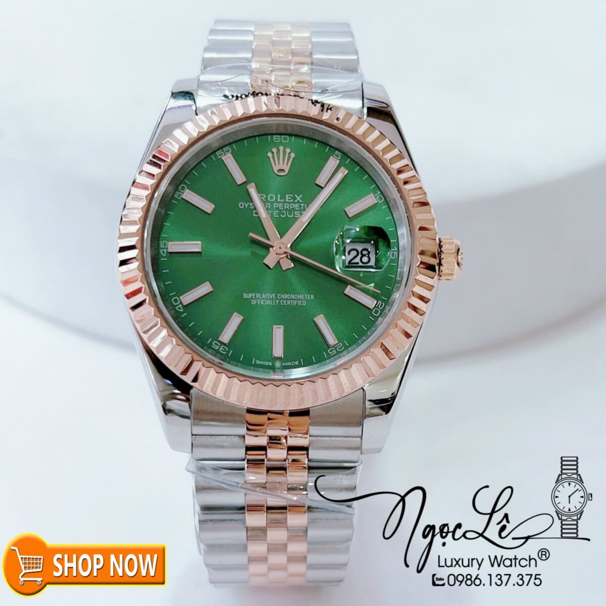 Đồng Hồ Rolex Datejust Automatic Nam Dây Demi Rose Mặt Xanh Lá Size 41mm Phản Quang
