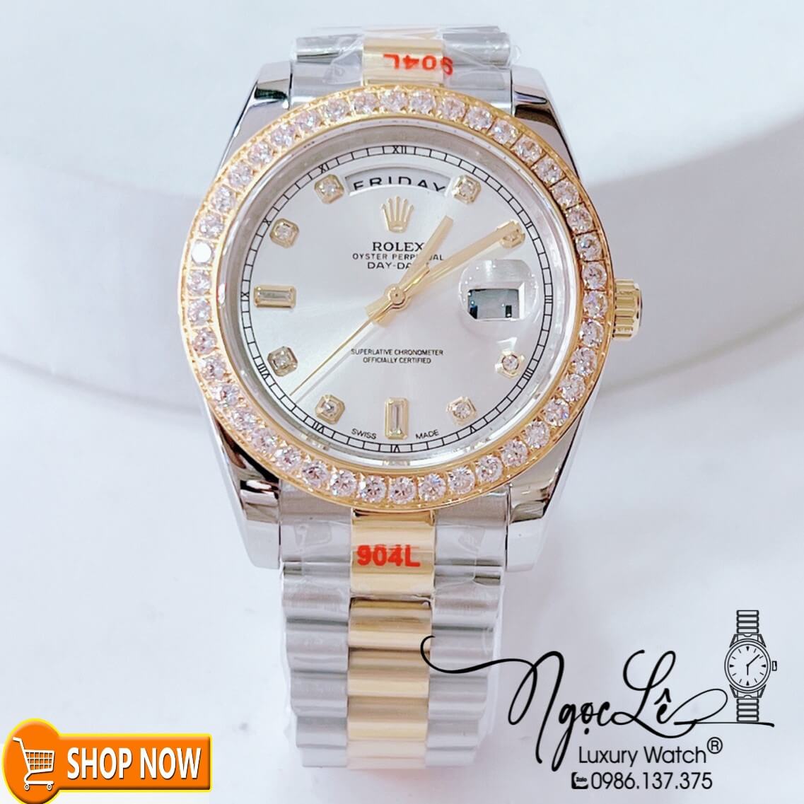 Đồng Hồ Rolex Day-Date Automatic Nam Dây Kim Loại Demi Vàng Mặt Trắng Niềng Đá Size 41mm