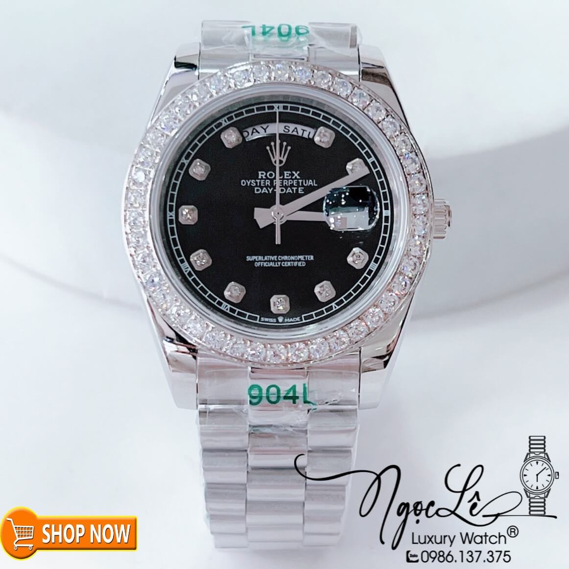 Đồng Hồ Rolex Day-Date Automatic Nam Dây Kim Loại Bạc Mặt Đen Niềng Đá Size 41mm