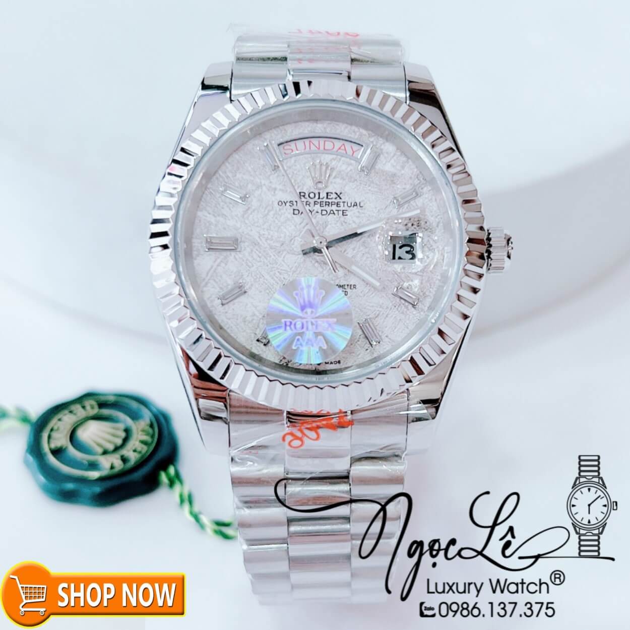 Đồng Hồ Rolex Day-Date Automatic Nam Bạc Mặt Thiên Thạch Size 41mm Phản Quang