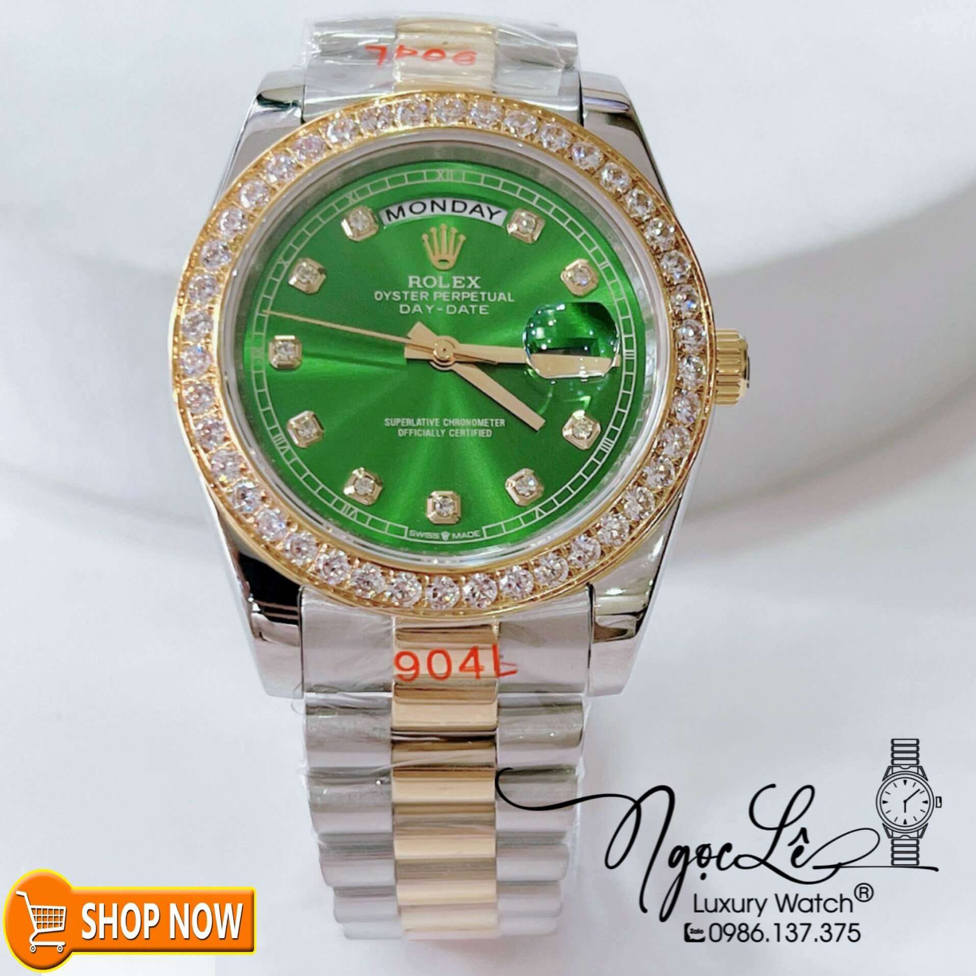 Đồng Hồ Rolex Day-Date Automatic Nam Dây Kim Loại Vàng Mặt Xanh Lá Niềng Đá Size 41mm