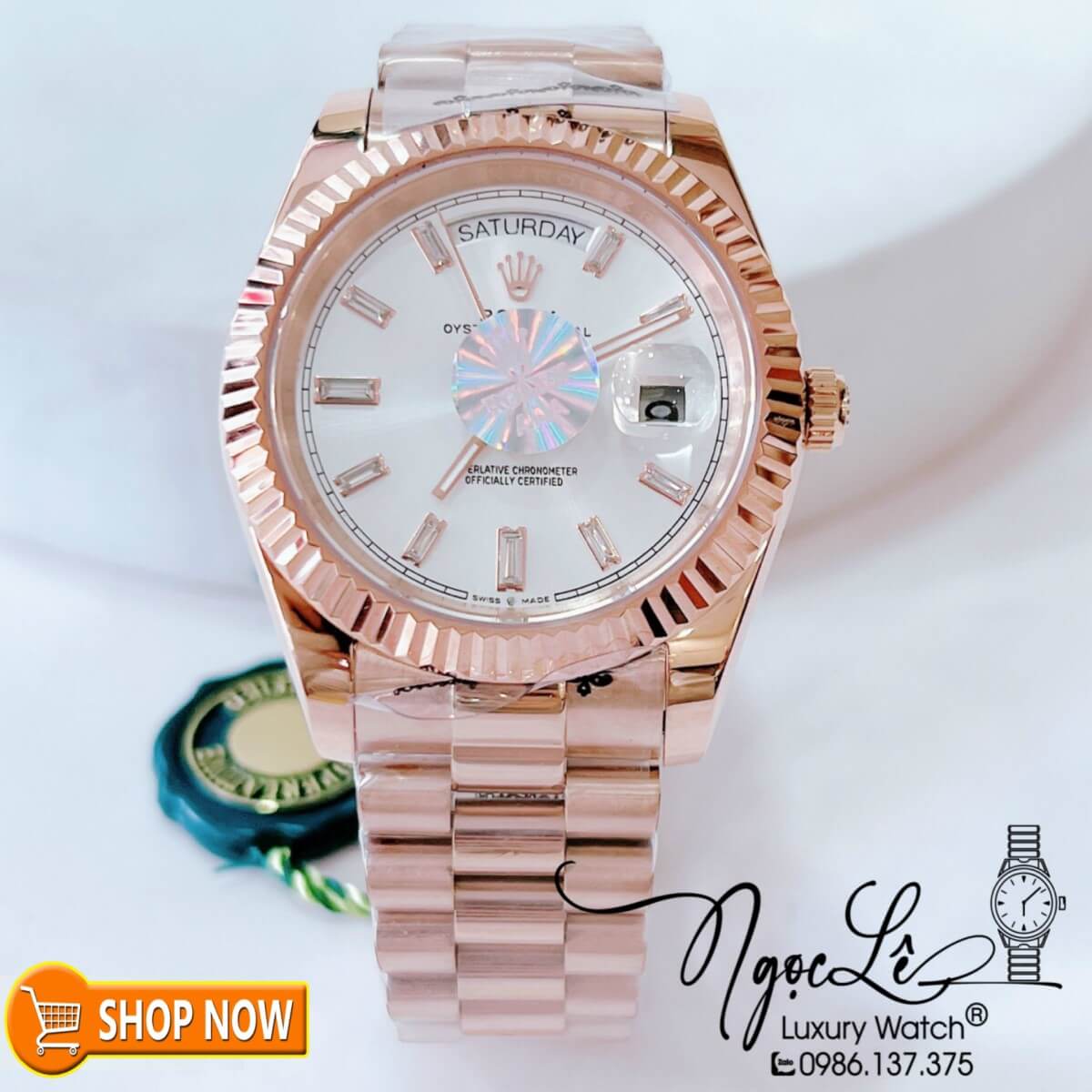 Đồng Hồ Rolex Day-Date Automatic Nam Dây Vàng Hồng Mặt Trắng Size 41mm Vạch Đá
