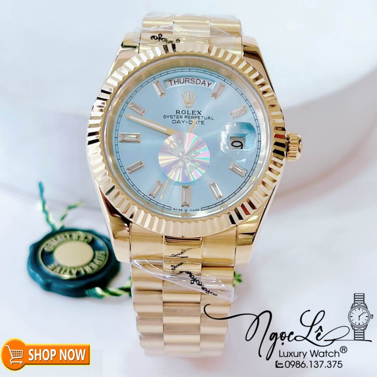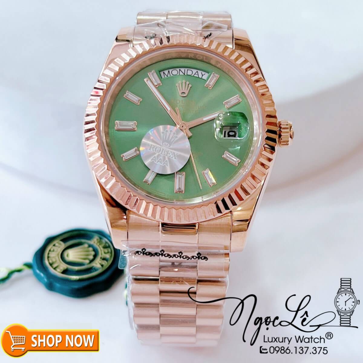 Đồng Hồ Rolex Day-Date Automatic Nam Dây Vàng Hồng Mặt Xanh Size 41mm Vạch Đá