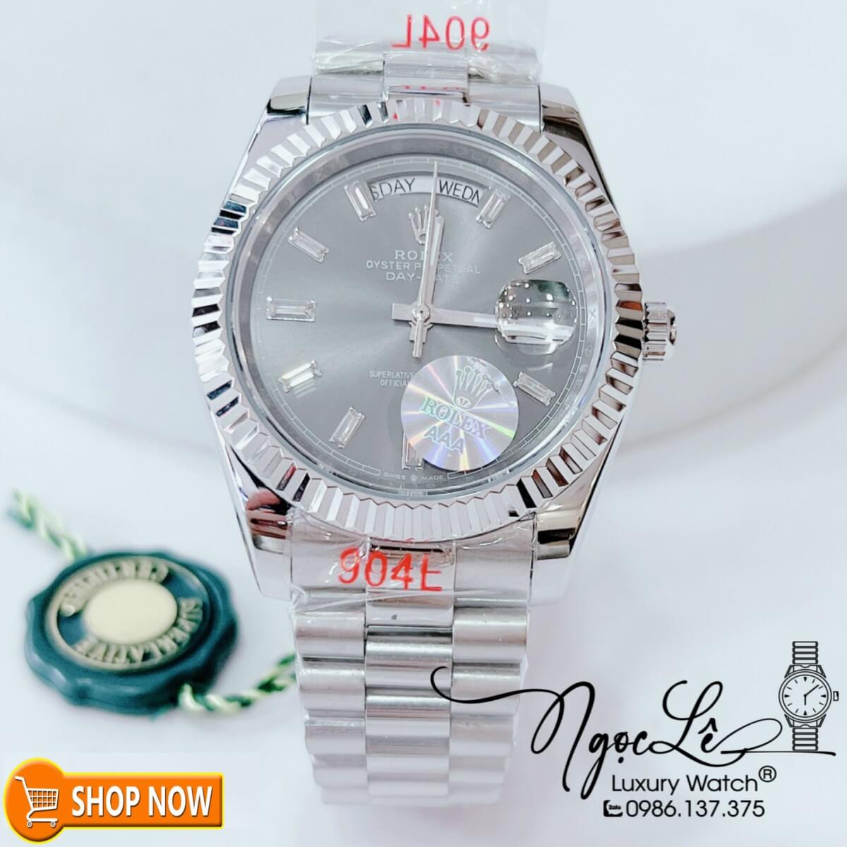 Đồng Hồ Rolex Day-Date Automatic Nam Dây Bạc Mặt Xám Size 41mm Vạch Đá