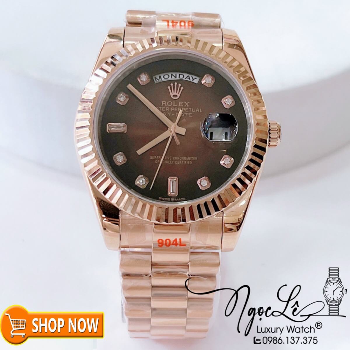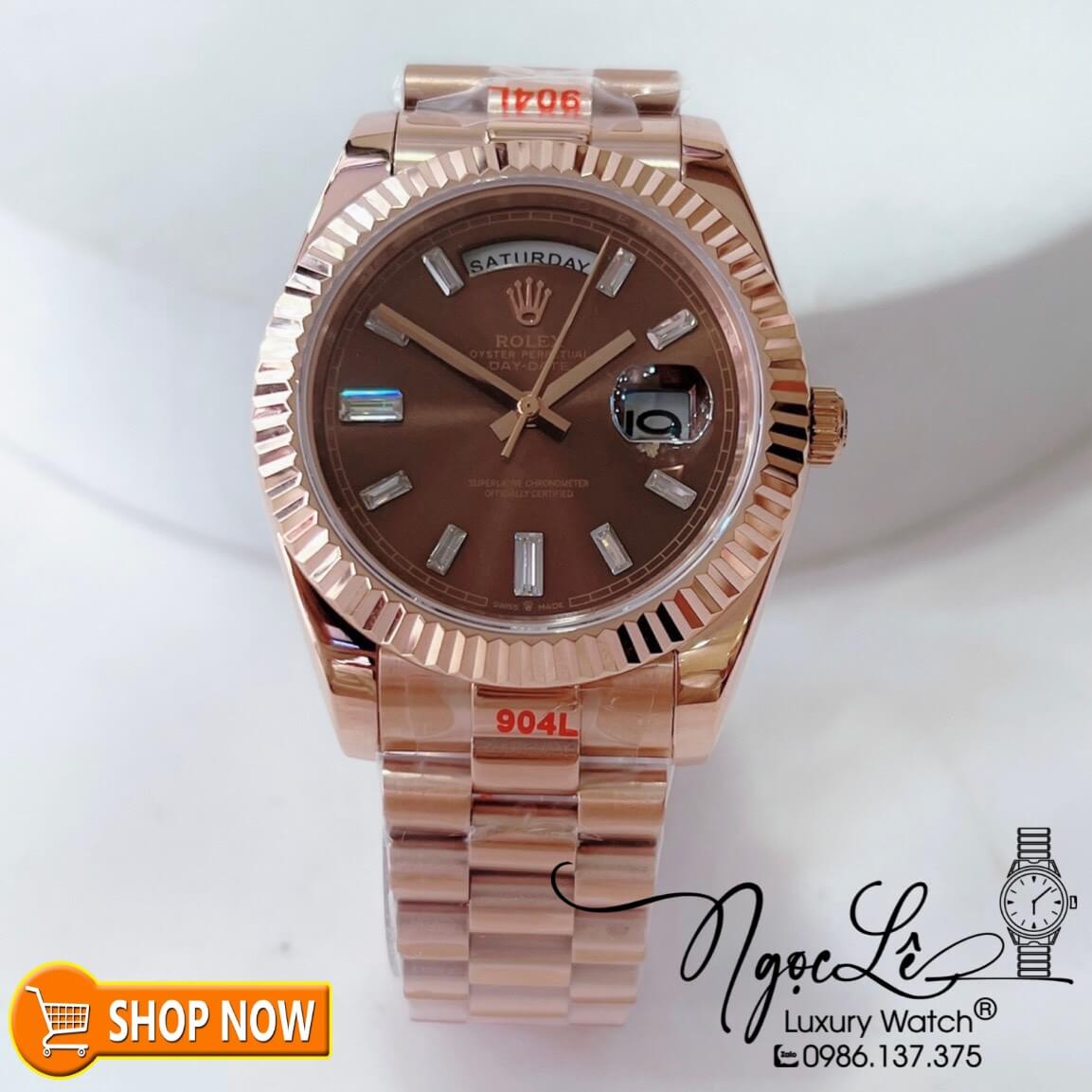 Đồng Hồ Rolex Day-Date Automatic Nam Dây Vàng Hồng Mặt Nâu Size 41mm Vạch Đá