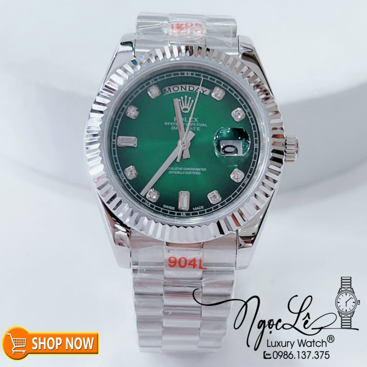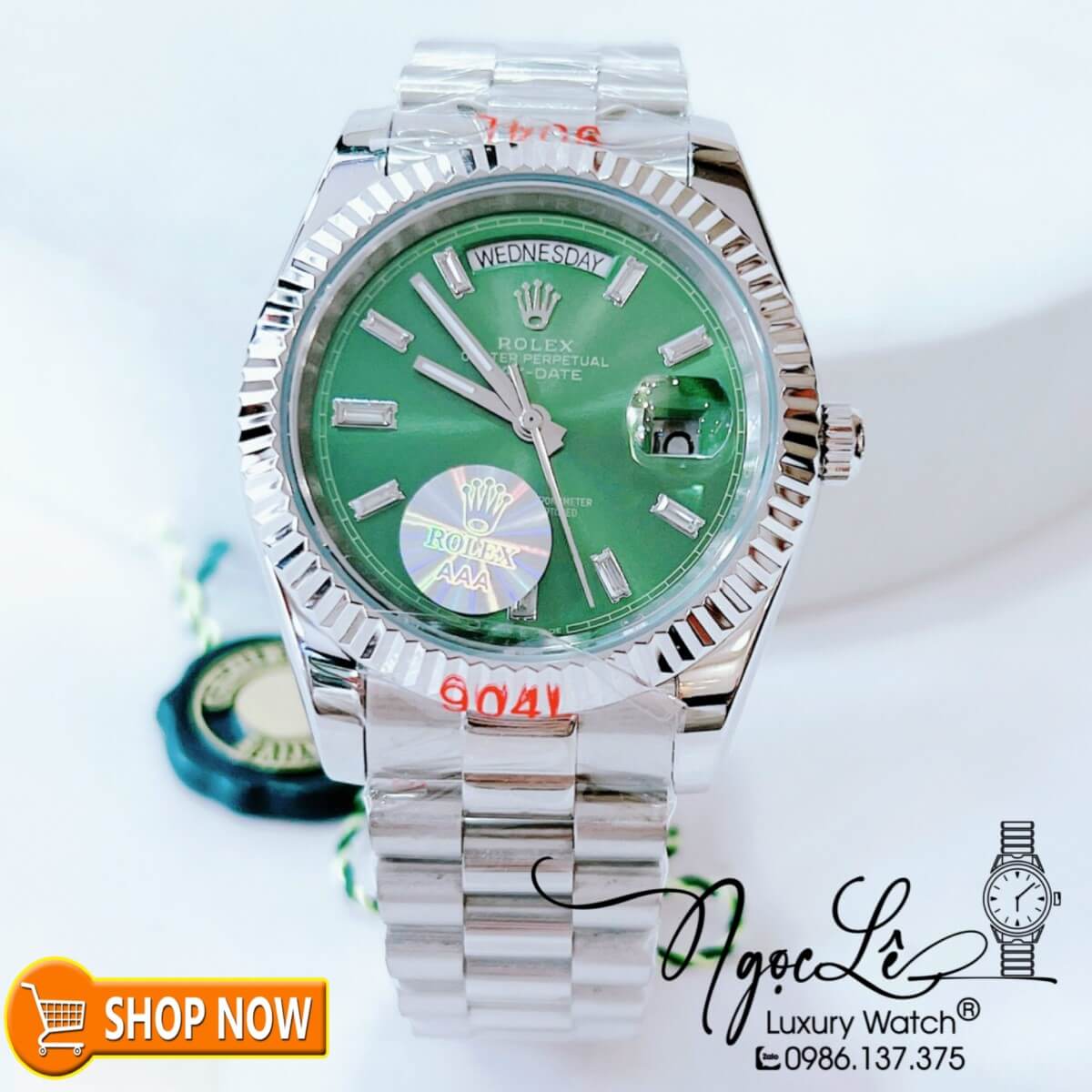 Đồng Hồ Rolex Day-Date Automatic Nam Dây Bạc Mặt Xanh Lá Size 41mm Vạch Đá