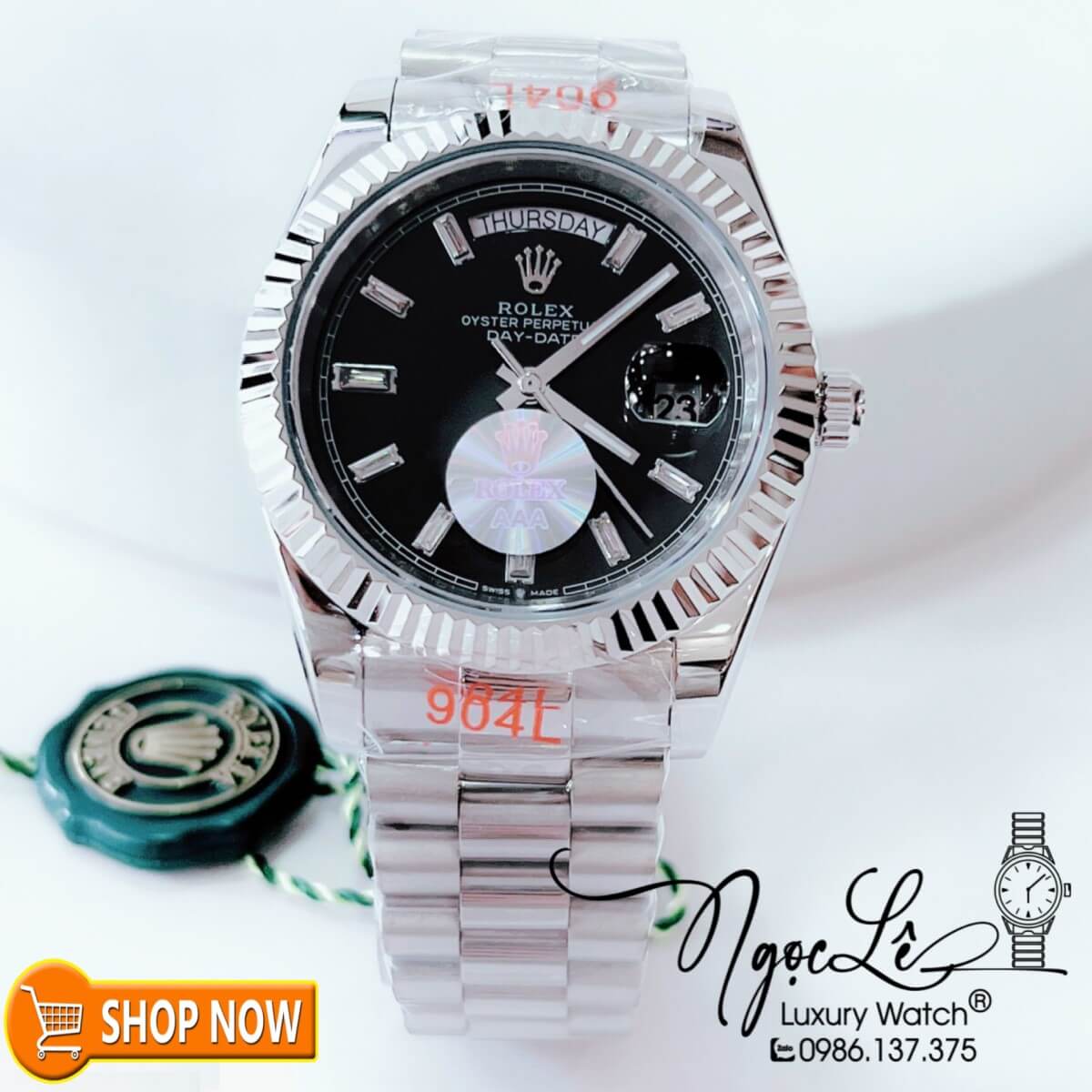 Đồng Hồ Rolex Day-Date Automatic Nam Dây Bạc Mặt Đen Size 41mm Vạch Đá