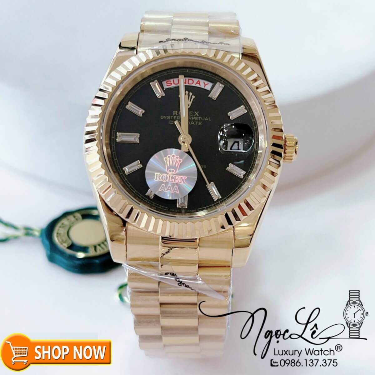 Đồng Hồ Rolex Day-Date Automatic Nam Dây Vàng Mặt Đen Size 41mm Vạch Đá