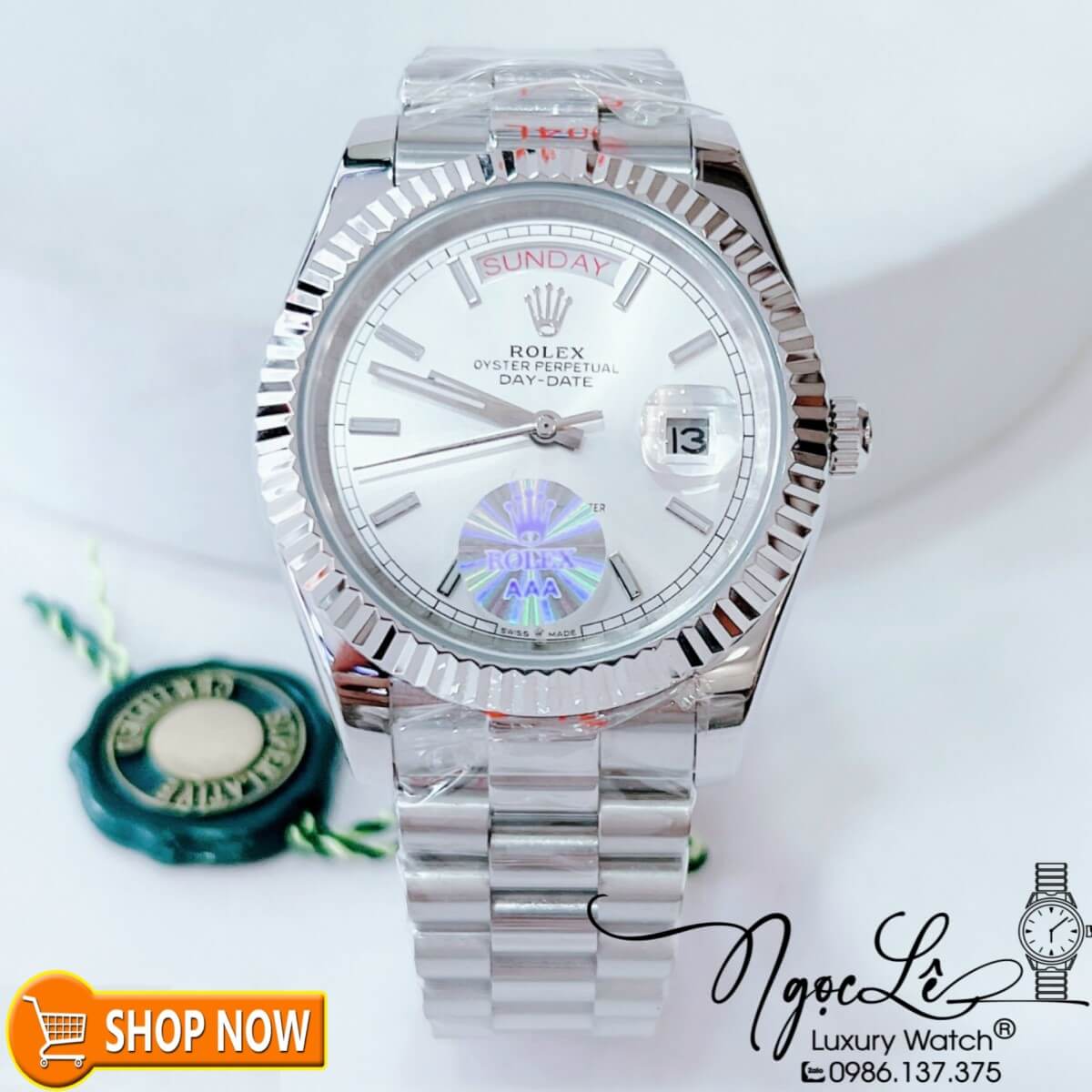 Đồng Hồ Rolex Day-Date Automatic Nam Dây Bạc Mặt Trắng Size 41mm Vạch Đá